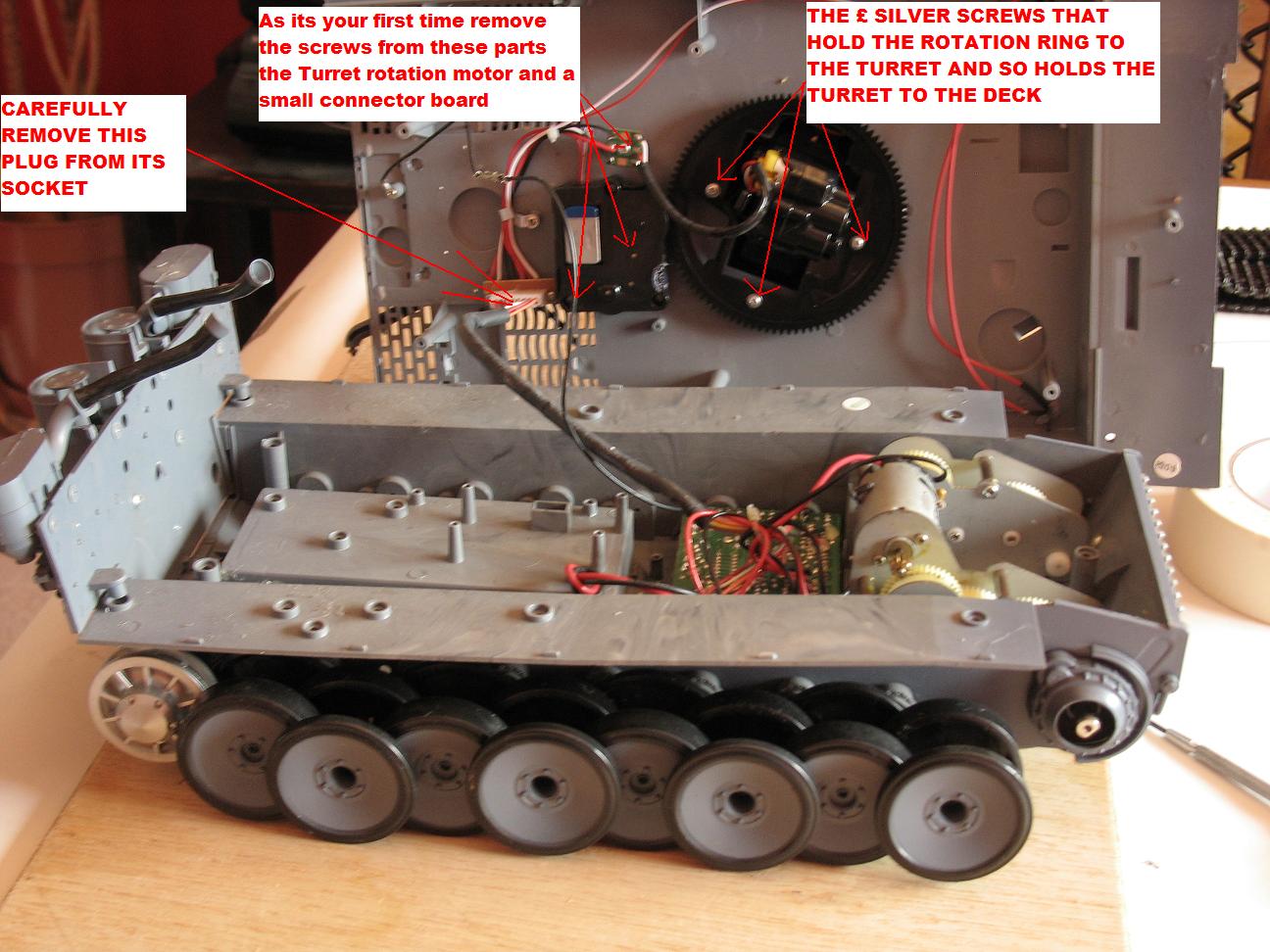 If you undo these 3 screws the rotation ring is free and the turret can come off the hull top.....BUT....You MUST be able to solder as you are almost certainly going to pull some of the small wires off of the connections.....so if you can solder then get out the digital camera and start taking photos, because you can guarantee that you will forget a part later on.
