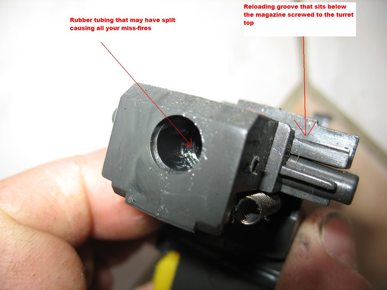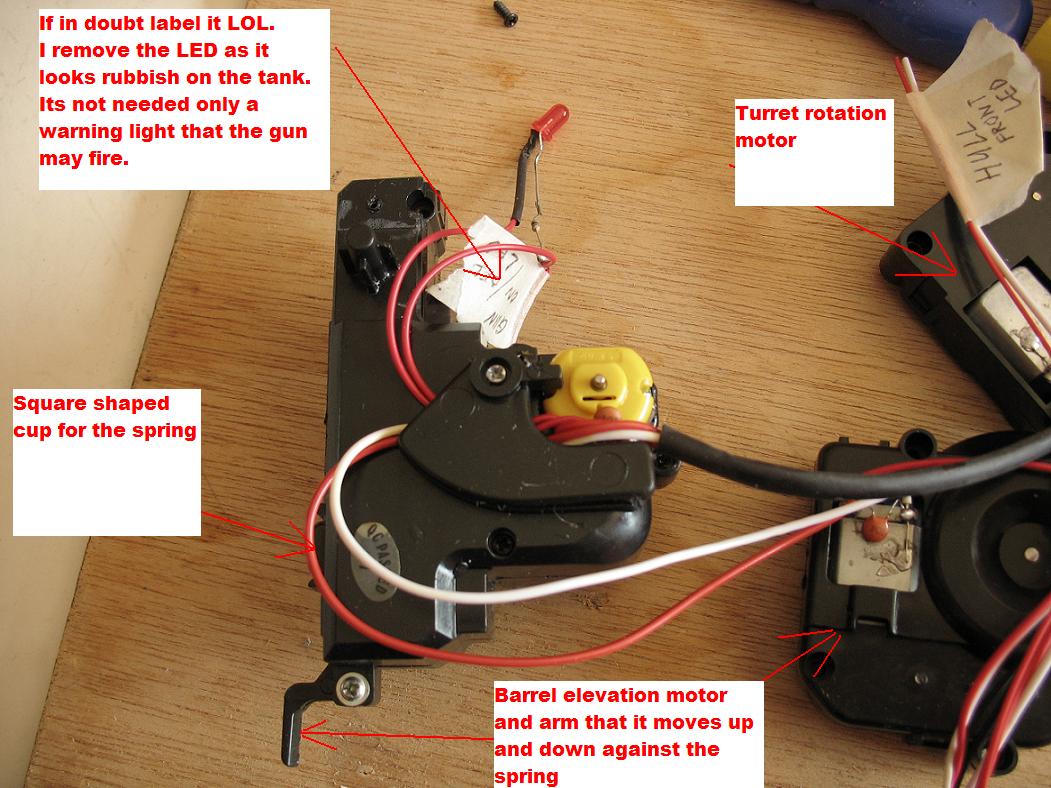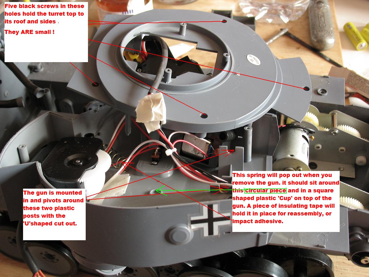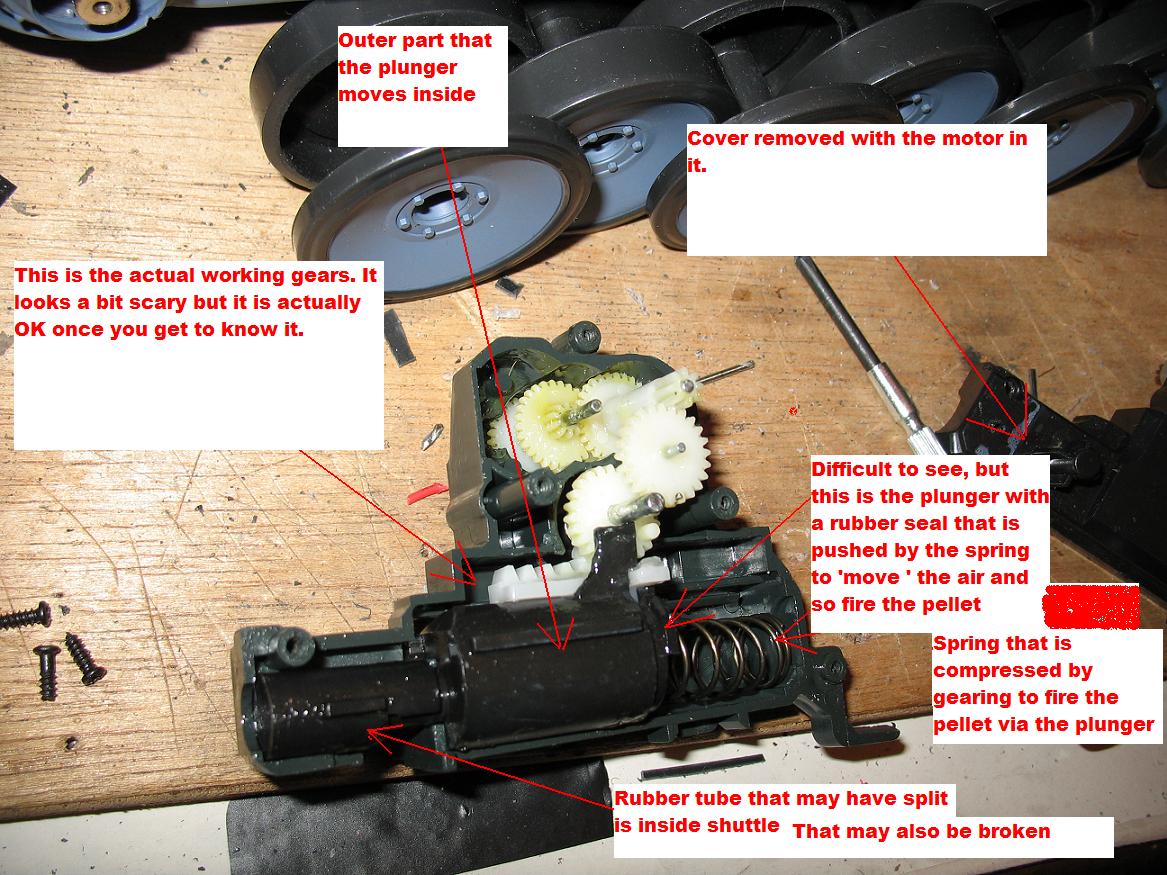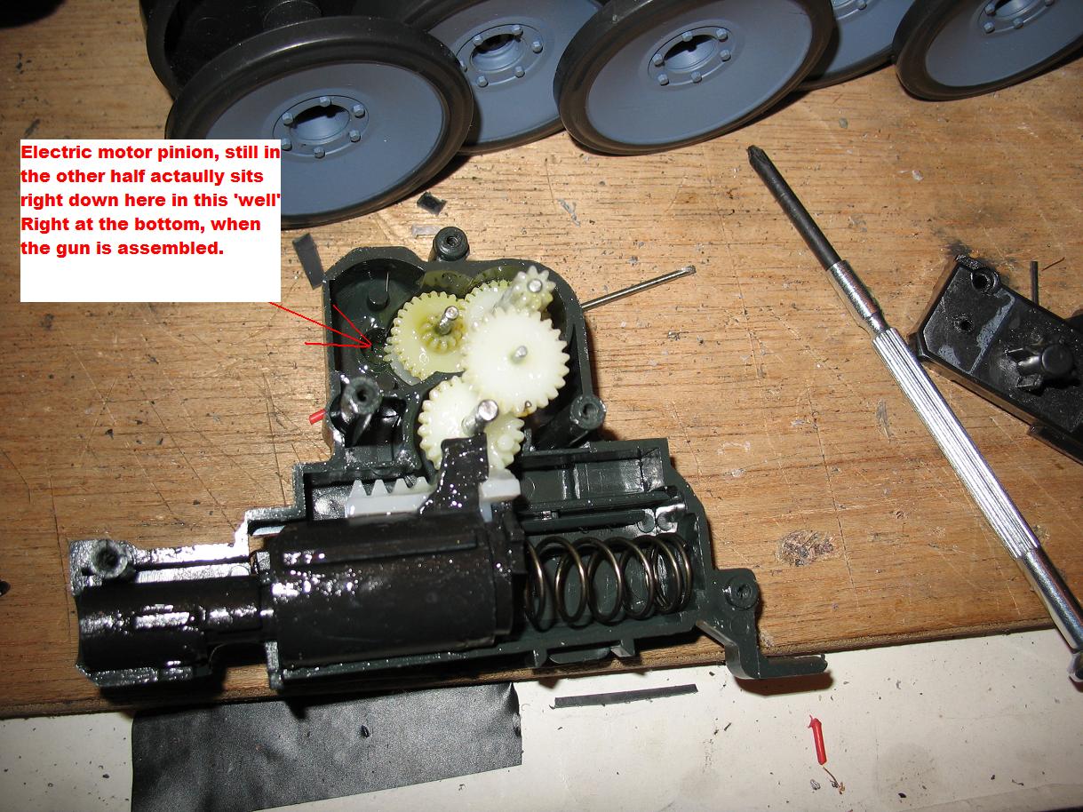 Firstly once you remove all the screws and split the hull and deck this is what you will see, sorry this is an old style receiver board from about 5 years ago. I recommend that you remove all these parts and feed them through the turret ring so that you keep it all together.....and Remember...Take PHOTOS as you go.... Remove the 5 black screws from the underside of the Tigers turret and this is what you will see, sorry the gun has already been removed but it is clear where it goes. All the parts on a board Here is the gun separated from the turret Close up of the actual gun unit and the screws that you need to remove to split the two halves of the casing. Mantle and barrel removed fron gun mechanism The end of the gun mechansim showing where the barrel slides into. Top view showing relading slot and shuttle Gun mechanism exposed once the side with the motor in is lifted free, be careful as some of the gears or metal pivot rods may try to 'stay' in the motor side. Another photo of spilt mechansim and where the gun motor pinion actually goes. Your Miss-firing will almost certainly be down to the 'Shuttle' being cracked or split in two of the thin rubber tube that is located inside it to seal the barrel to the airsoft unit and also it prevents pellets from just rolling out if the barrel is depressed or you are going down hill.