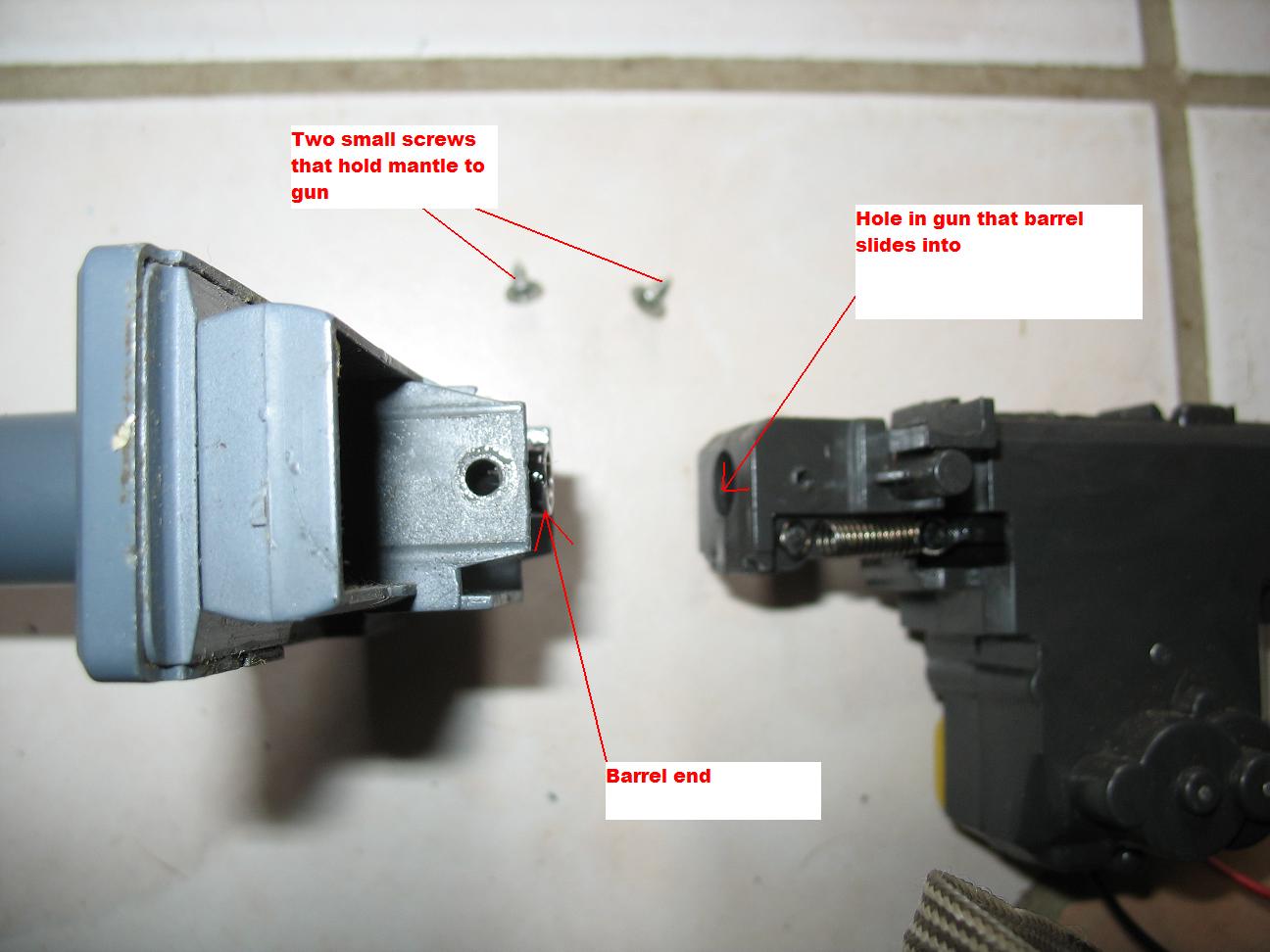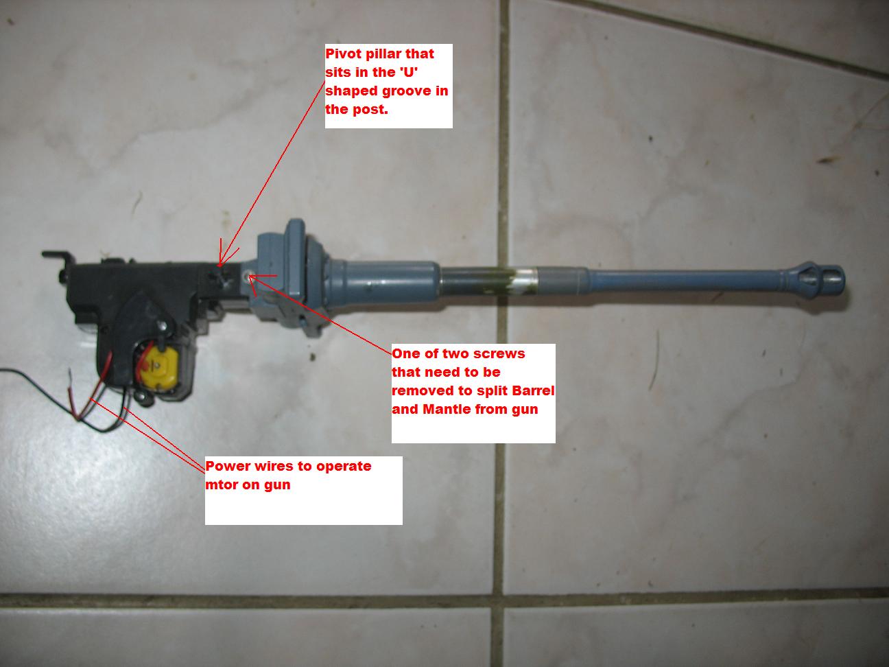 I think that you WILL need the help of your good lady, the screws and the gears ARE small. If it is the small black piece of tubing that has split then you could TRY to replace it with another bit but I cannot think of a source. It may also be the coupling between the barrel and the gun mechanism that has cracked and broken. This seems also to be fairly common and for some reason the plastic just will NOT glue back together again the part is often Pink in colour and is visible through the reloading port when you remove the gun from the barrel and turret.