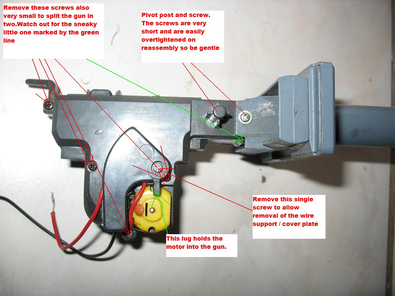 My money for the misfiring would be on the small black rubber 'Tube' that connects the gun to the barrel,they are of poor quality and are easily split. There are lots of small self taping screws involved in the gun and 4 or 5 gears as well as the electric motor. You say that you have big hands etc..... If you want to continue I will either find you a 'How to dismantle the gun' in a thread or write one for you with photos.....please let me know what you want to do next ??