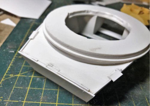 The design of interlocking joints is also unnecessary as it creates a lot of extra work for the modeller that has to fill in all the gaps they create, with limited solidity benefits. Gaps are filled with plasticard residue strips and dust, and poured with superglue before sanding and polishing. A plasticard 4mm thick additional turret bottom ring is added. Superglue is an excellent filler.