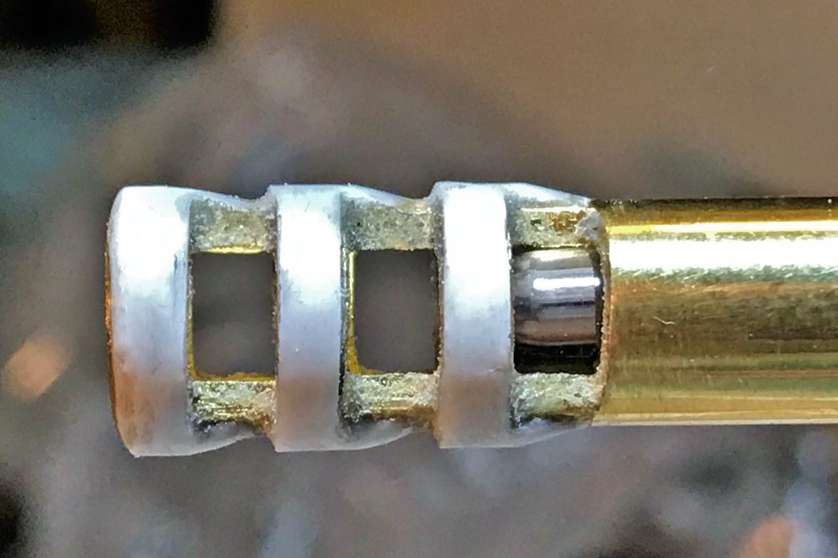 The muzzle brake is installed with a 5mm LED for gun flash with resistor. Fresh from the grinder, it needs some fine tuning and polishing when I will have a cooler head.