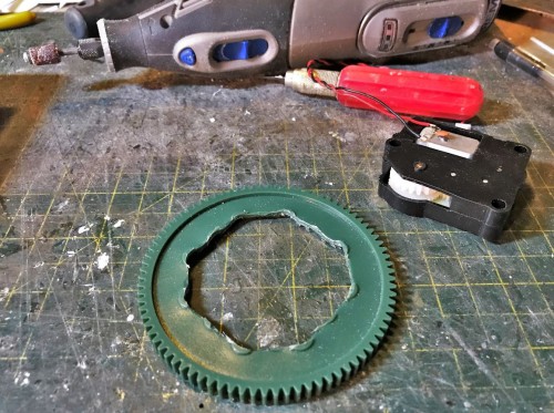 For turret rotation, a large VEX Robotics gear is used with a standard Heng Long rotation unit. The wheel is made hollow with the Dremel in order for the elevation unit and cables to move freely. Although Ludwigs provide plasticard inward dented rotation halves that can be assembled for a rotation wheel, use of it is definitely not recommended because it is weak and you might not be able to glue it totally round on the turret base, creating major issues and waste of time. It is highly recommended to use a VEX robotics gear and I will always be grateful to Carl for having pointed them to me. These are available for a few dollars at RobotShop.com.