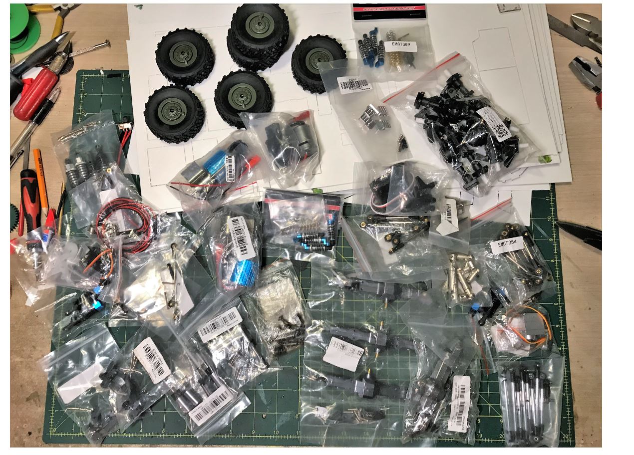 I have assembled a lot of mechanical parts for potential use on the build. I mean; motors, gearbox, axels, suspension parts, drive shafts, shock absorbers on many sizes, metal and plastic, etc. I need to reduce the cost of this build so I am planning to use the least expensive method possible to power it. I still do not know how I will make it work but it definitely needs power on its 6 wheels, and steering on its first 2 shafts.This will be interesting and something I have not done before.