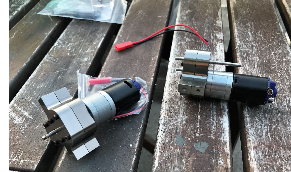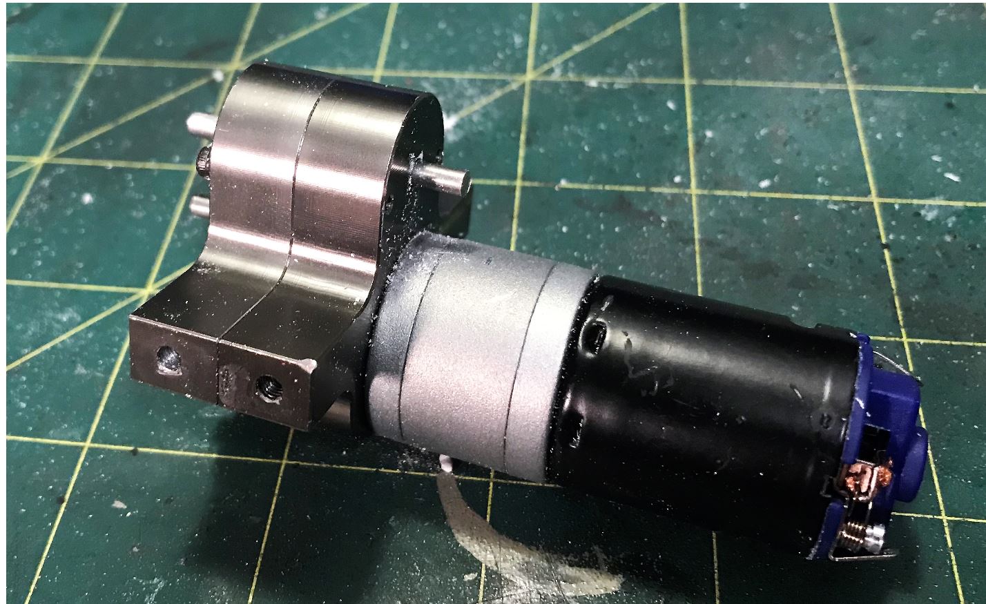 There is not much space between the axles so the two 370 motors with gearbox needed to have their main shaft connecting to the drive shaft cut to the minimal length possible, and another groove was filed for the mounting screw.