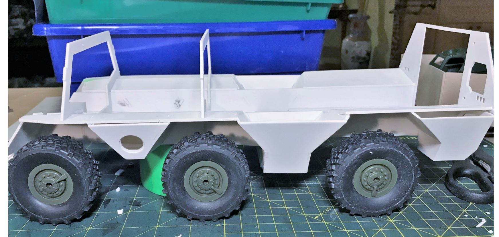 The 1/16 WPL B-16 wheels are about 2mm too small in Radius compared to the 1/35 kit. I think it still looks ok. I got a Michelin sample alternative from AFV-Model but it is 2 to 3mm too big in radius...not better. Good thing I did not order 6 of them because they are expensive. So, I will use the WPL, cheap and easily available by the dozen at a bargain price. If I could make them to bulge just a little instead of their natural inward aspect, it would be better. I am planning to add the WPL weights to the wheels, I might be able to do something that builds on them on the inside.