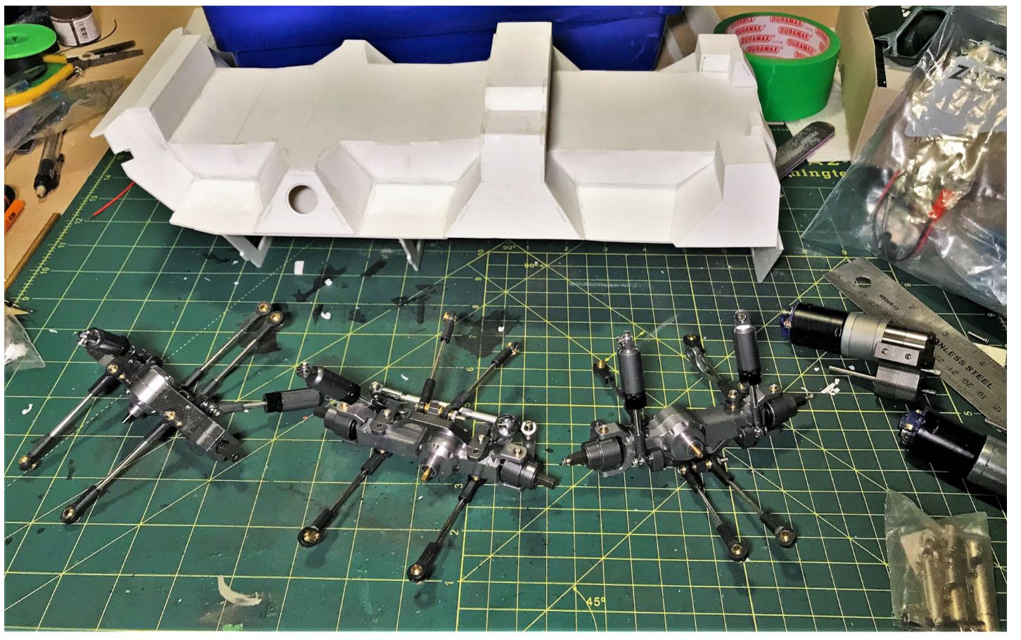 To complicate things, the two front axles have steering and the two steering servos will need to work in tandem and provide the right angles for efficient turning.