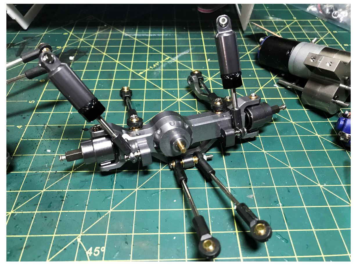 This is the metal front axle with its regular pull rods, damper mount and dampers mounted and ready to be analysed on how they can be mounted on the Fuchs in a functional way. It was very interesting doing this analysis, while trying to keep the spirit and look and feel of the Fuchs drive train.