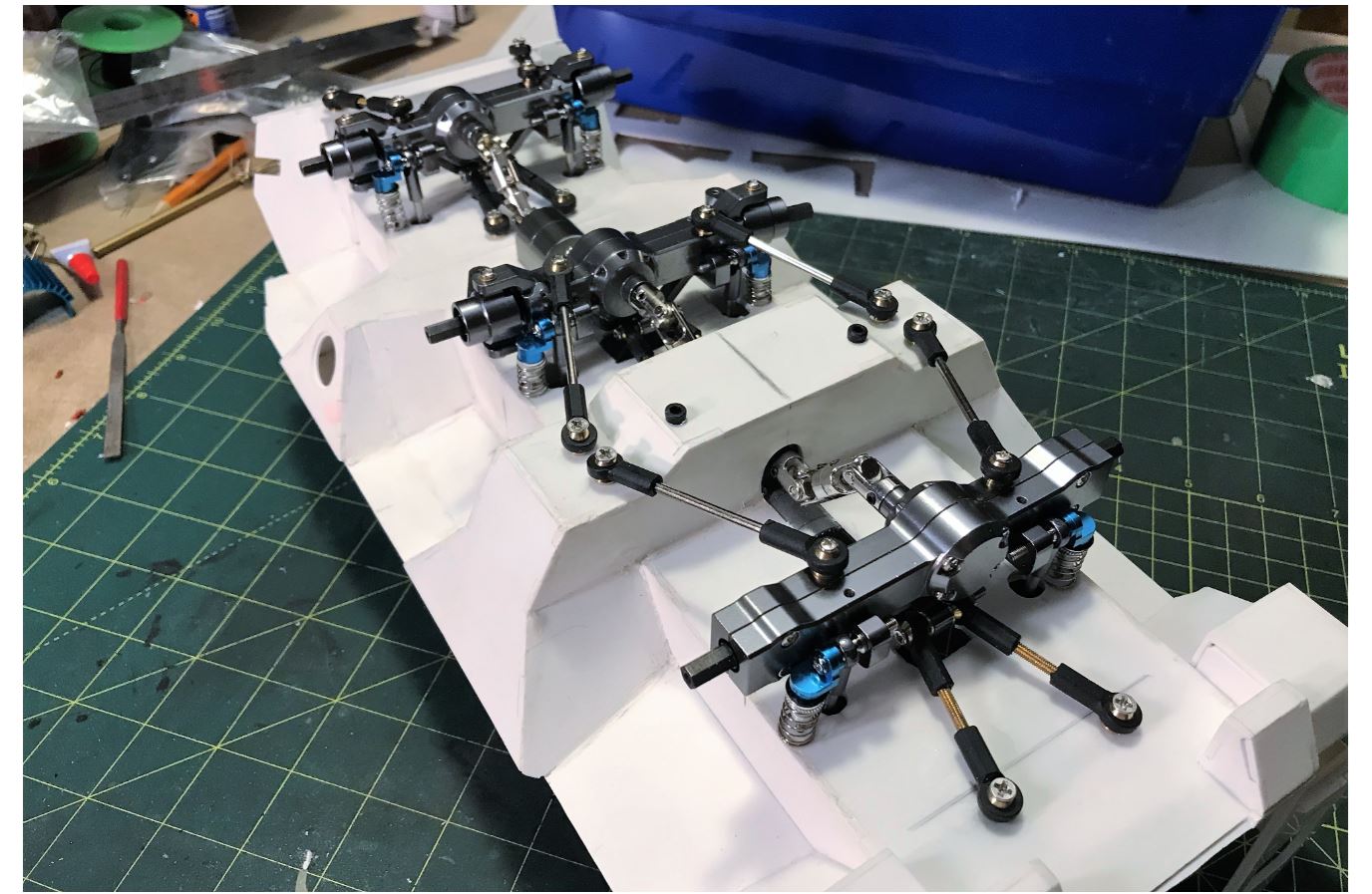 Because the axles are not long enough for this huge vehicle, I could not install the dampers and shock absorber externally like the real fuchs, and like I originally want to... Too bad. So, to maintain the integrity of the pull rod mount and keep the vehicle fully RC functional, I placed the dampers and shock absorber internally where they can provide appropriate support. As per previous post, I ordered shaft extensions for the wheels that will provide 1cm extension on each side and connect to the wheels. I have not received them yet.