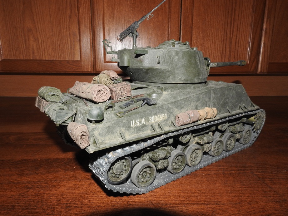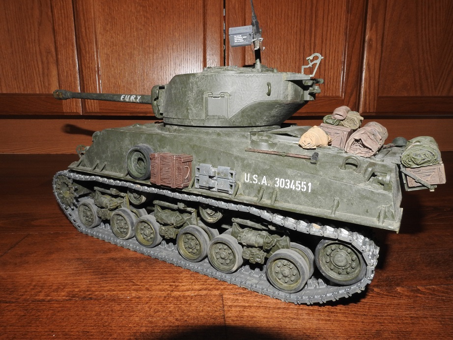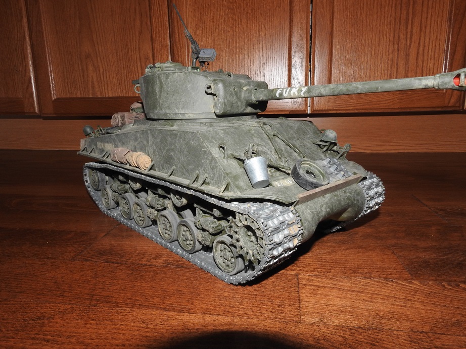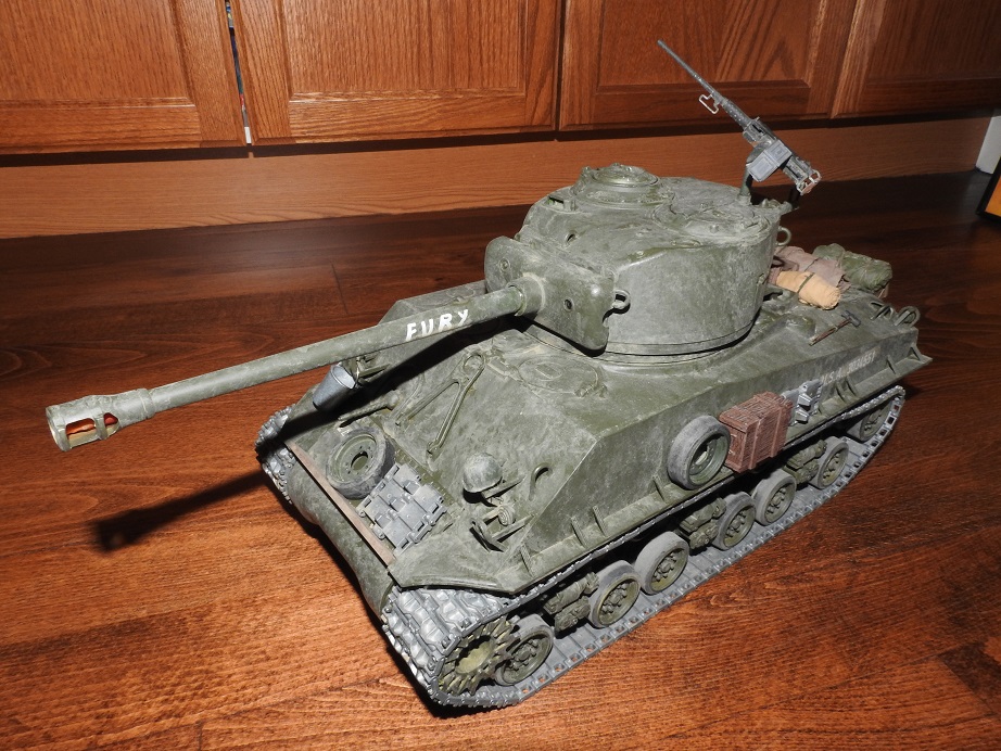 Okay here is my take on the "Fury" built. No logs, but does have the name. Taigen all metal turret, Tamiya electronics upper and lower. Since it was a Sherman lower there was no recoil from the DMD, so ended up using the "servio" from RCTA to control the Taigen recoil unit. Kit bashed by me, weathered by Airbrushler (fellow tanker here) and Brad Pitt by dgsselkirk.