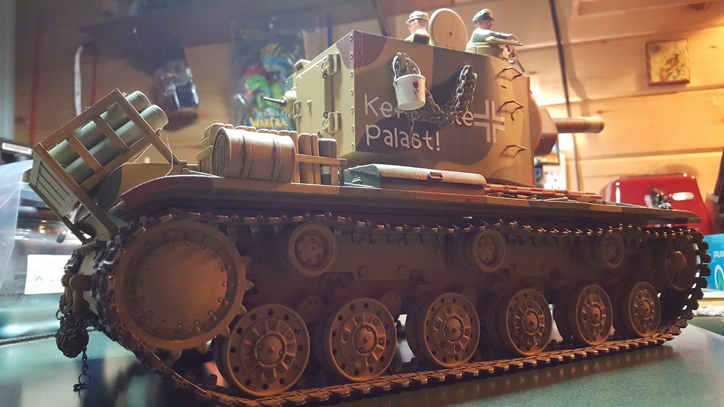 For your perusal I resubmit The Crackerbox Palace. A captured Soviet KV-2 redesignated as a 754(r) by the Wehrmacht and set up for a planned invasion of Malta early in the War that never came off. While the 'Palace' is a fantasy designation, the tanks were real and when the invasion was shelved, went back to the Eastern Front to fight against their former masters. This tank was built by me from a Taigen all metal KV-1 and the excellent Torro KV-2 turret. Lots of extra metal got added over the years including steel gearboxes and a brand new lower with the upgraded bearings. The paint is by me and is a rattle canned Tamiya primer and Model Masters Dunkelgelb overlaid by a hard edge camo pattern applied with brushes and taken from pictures in several books on Stalin's Giants ( and an excellent KV-1 Build here on the forums from years gone by ) The 'Palace' is still the largest tank in my collection and stands tall over even the mighty IS-2 and Porsche King Tiger. Enjoy!