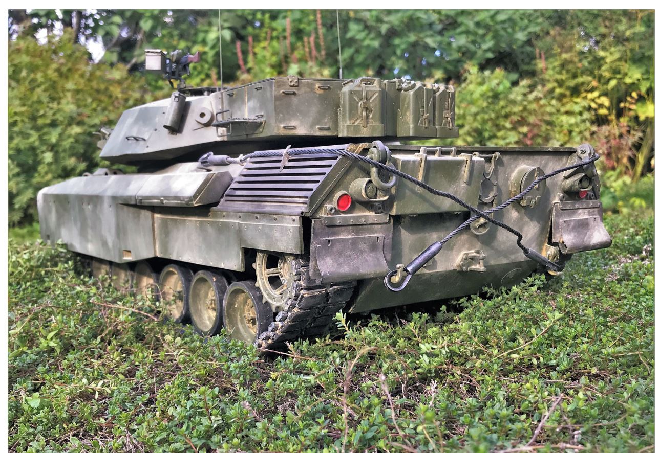 This is an RC Canadian Leopard C2 MEXAS in 1/16 scale. The Leopard C2 is the older Leopard 1A4 chassis upgraded with a German surplus Leopard 1A5 turret, Canadian designed modifications and Modular Expandable Armor System (MEXAS).