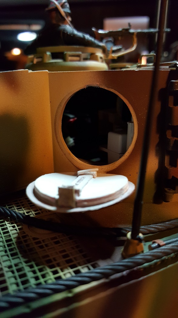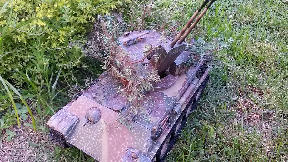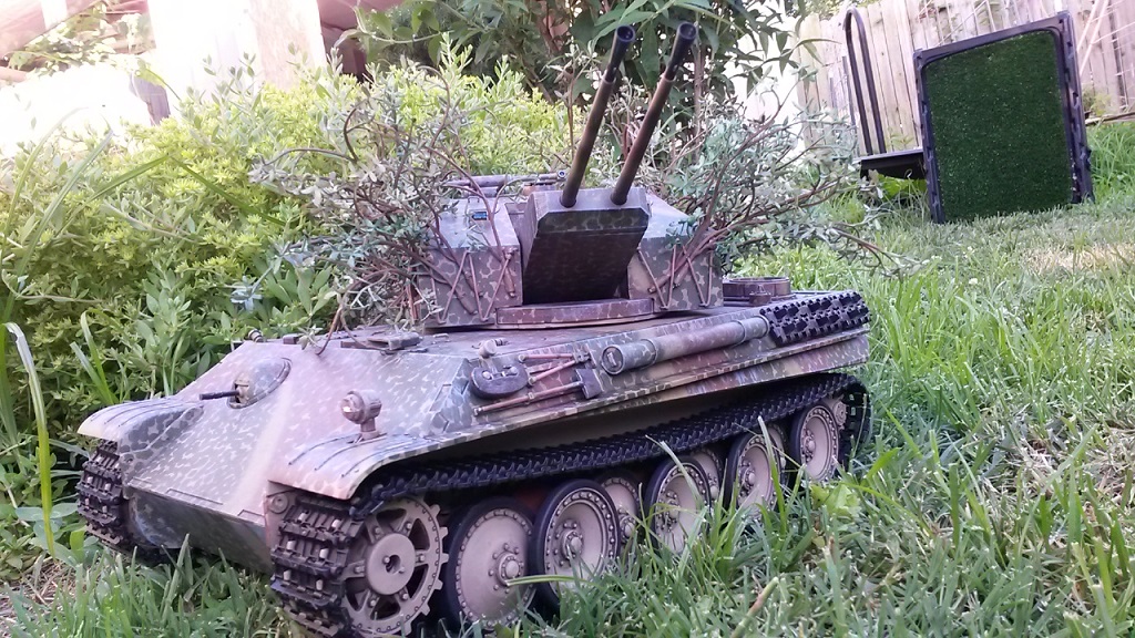 It's a HL Panther , with standard running gear. The Coelian conversion is from Asiatam. I used a gear motor for the elevation. The targeting sights are tied into the barrels and elevates with them at the same rate. I tied the white LED's into the M/G to get a look more representative of the AA fire rate, and clear acrylic rod to light up the barrel ends..