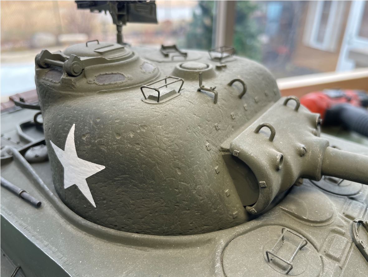 For the conversion, i will use an old Tamiya M4A3E8 HVSS that i built as a young man in the early 1990s and kept on the shelve ever since. I always found the small turret with the 105mm gun to be simplistic and quite unimpressive. I already converted two of these Tamiya Shermans to the 76mm turret with the Nick Aguilar conversion, i need something new.
