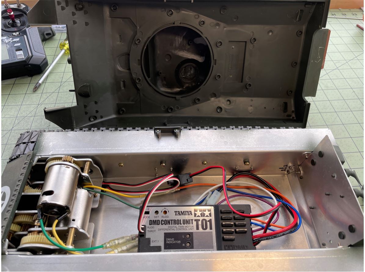 Looking inside, the old Tamiya has a decent gearbox, but the T-01 board only allows the tank to be driven around, it has no turret or other functions. There are people that still pay $500 for these on eBay.