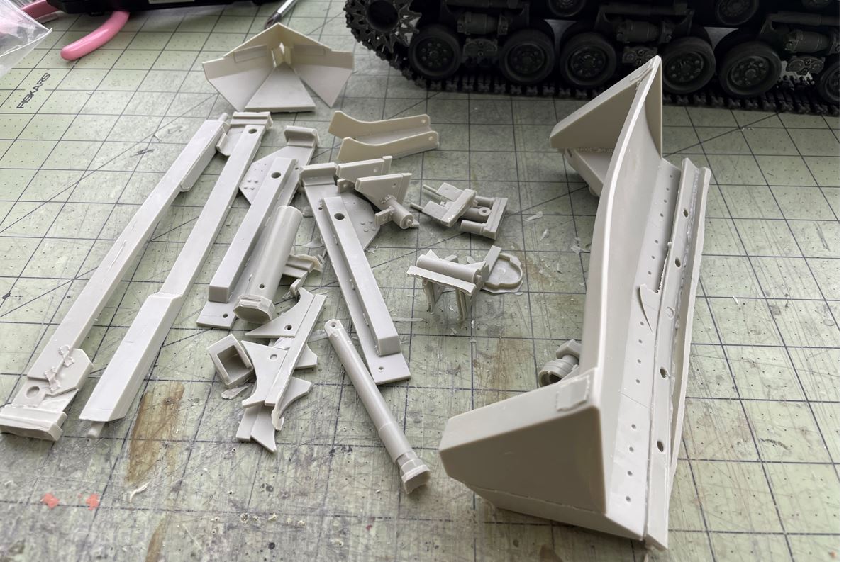 This is the Vandra M1 bulldozer 1/16 resin conversion kit. As usual, it comes with issues. Notice how the spade is warped and has a broken section.