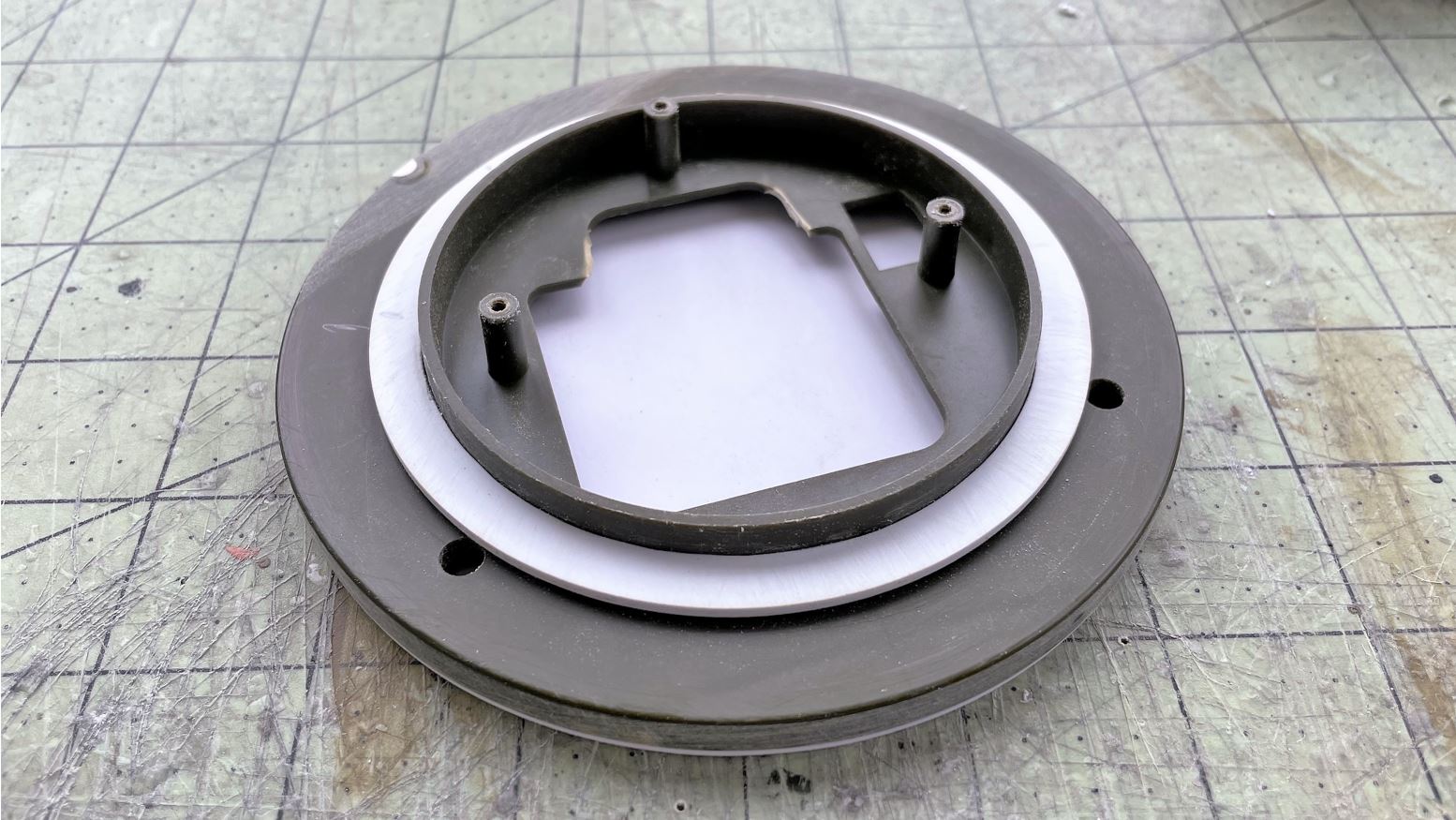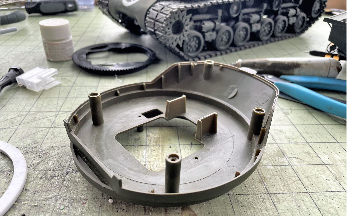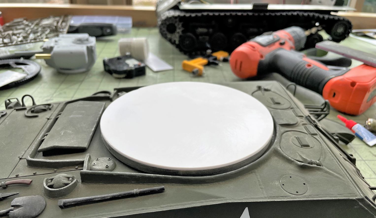 The Heng Long turret base just need two roundels to adapt it to the Tamiya upper hull. One to fit the turret ring of the hull as shown below, and one overlayed roundel over the lips to hold the turret in place for a smooth rotation.