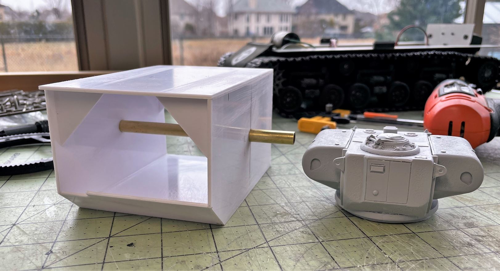The frontal area is completed. The back is left open until the elevation system is in place. Because the turret will have no recoil system, the electronics inside will be very simple, one servo for elevation and large LEDs on the rocket launcher tubes.