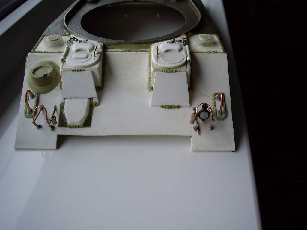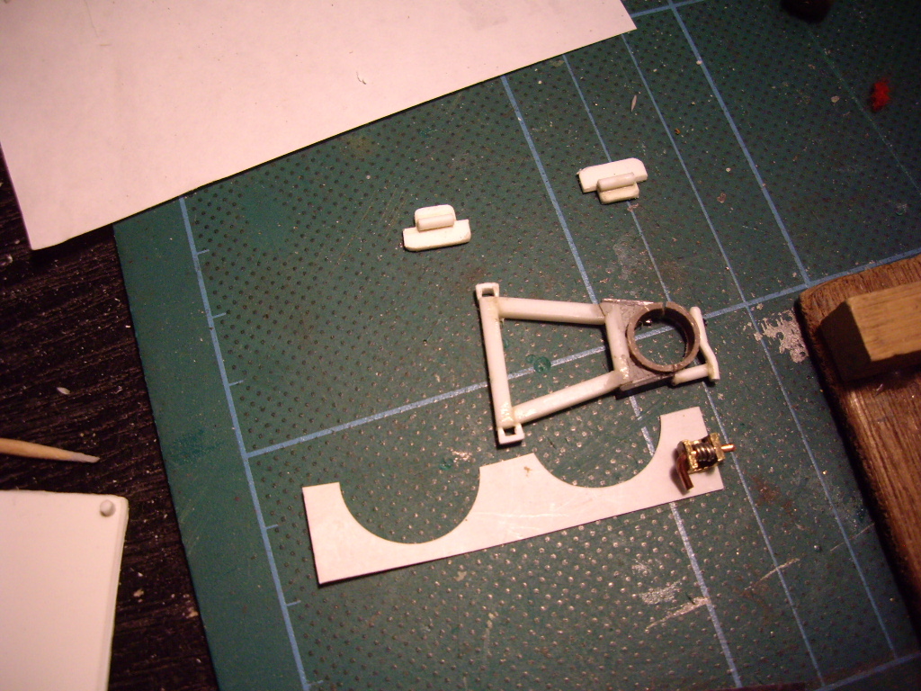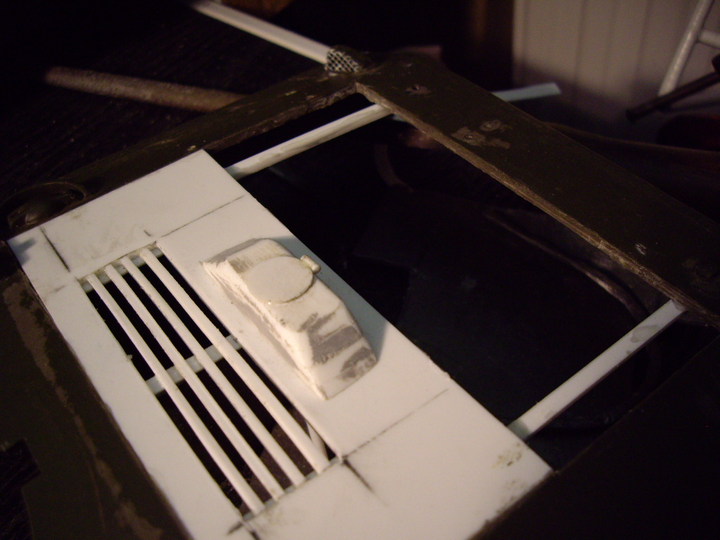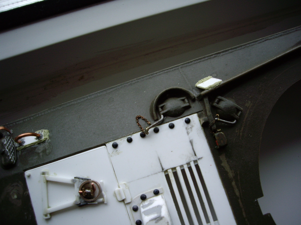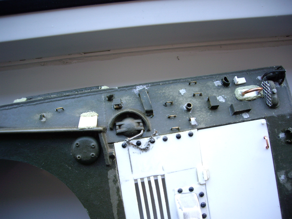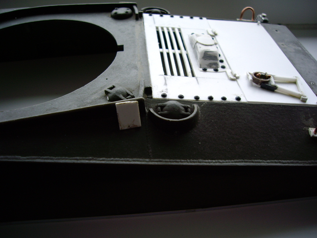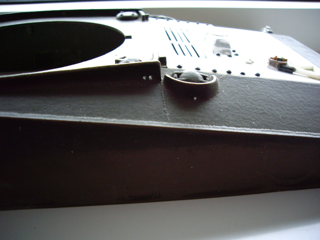 so now we try a first coat of paint ..also the new tranny cover built from plastic card and pill boxes this is only a prototype but wiil stay for the time being, as i had to use lead sheet to get the shape of the front also used it to get the shape of the flanges of the three cast hull ,, the nuts and bolts cut from plastic rod some heated also a square one for the nuts and thin one for the thread wow it ,s not easy ...........