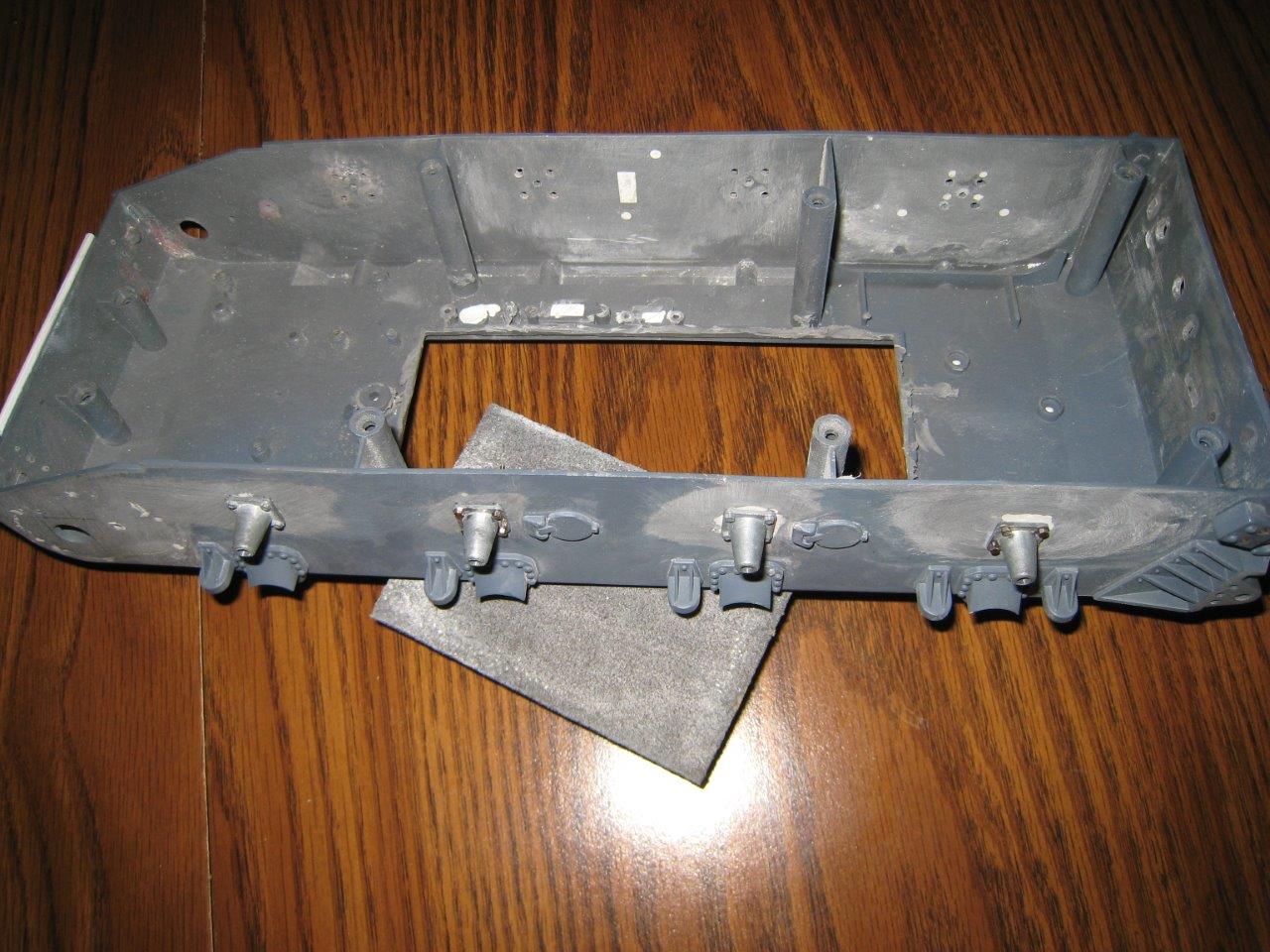 With interior cleared, I started working on the reinforcement in several stages. The first stage required creating templates using cardboard. This included test fitting the upper hull with the turret rotation motor. To get the switch shelf high enough, I have to work around the rotation motor. But this will allow access to the switches from the engine hatches. After the templates had been created, I cut the reinforcements from styrene using 3-mm styrene for the sides and 2-mm styrene for the rear. The rear also needed to have ½" holes cut for the exhaust. The holes need to be big so that they have room for the tubing to fit over the exhaust stubs. With the reinforcements cut, I test fitted them using rubber cement.