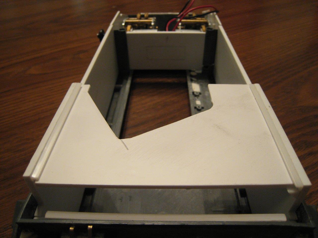 The reinforcements in the rear have been epoxied in place using JB Weld. The shelf brackets are made from 5-mm triangle styrene and 3-mm styrene angle. I used plastic weld to make those permanent. The switch shelf is 2-mm styrene.