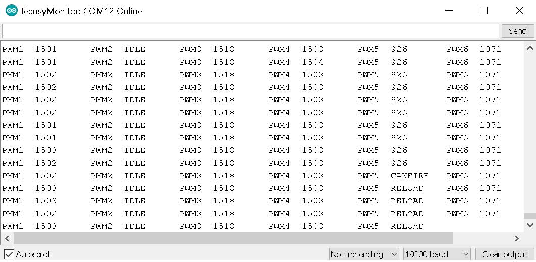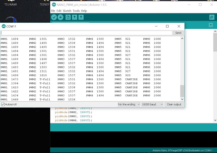 Did some more work on the code. I can now see six channels (soon to be 10) all arranged in nice neat rows and columns. Also, set some outputs like CANFIRE Cannon fire channel 5) and T-FULL (full throttle channel 2) when PWM signal is received at right frequency. Still at the very basic level...but working enough to test Tsunami sound board...