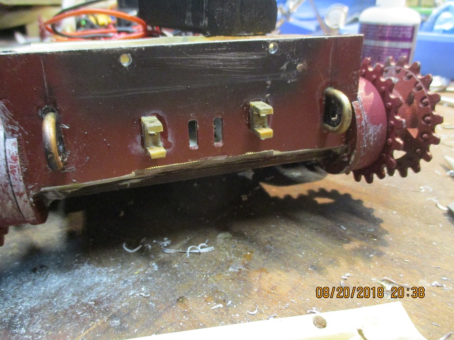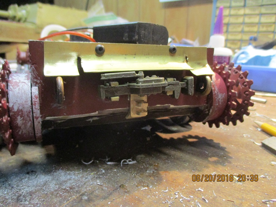 Machined rear center hitch from one piece brass. Sheet metal for the electric motor cooling deflectors. OEM was 3 piece, but easier to make as one. Tow eyes brass and 3D printed centers. Jack and mounts modified from king tiger....