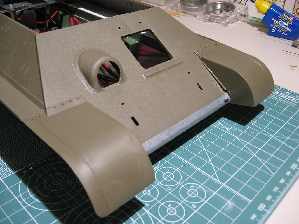 Good to go! I'll texture the styrene at the rear to match the edges of the other armour plates, while at the front the fenders will cover up the joins. Even unadjusted, they look about right: