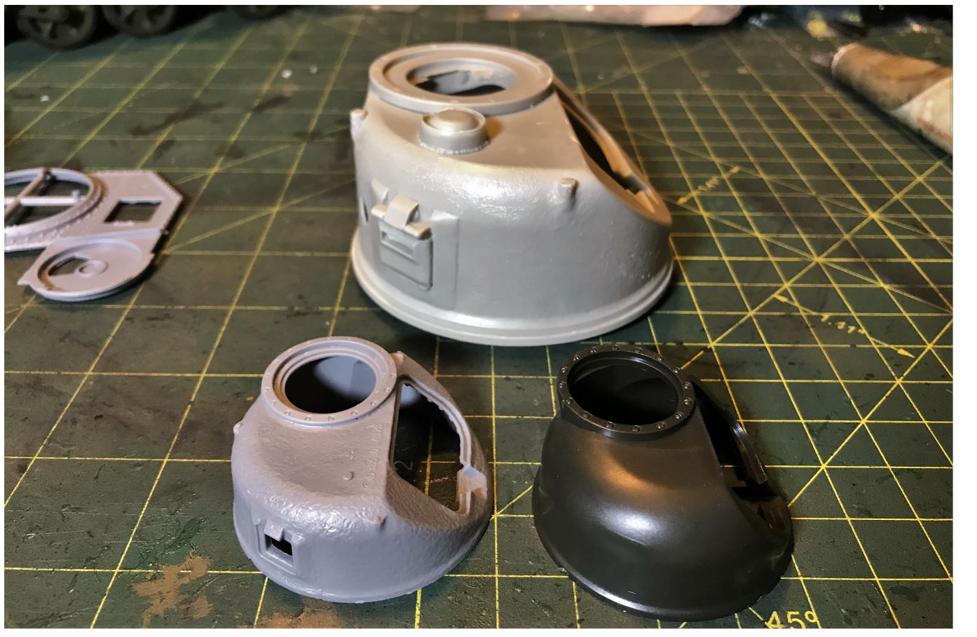 Comparing the shape of the Tamiya (front) with the Miniart turret at the back. It seems Tamiya got the upper turret shape wrong, too round, and it should not be used as reference. I did not see any references indicating a different model of turret (prototype, early or late) that would explain the differences in shape. Miniart is the one to be used.