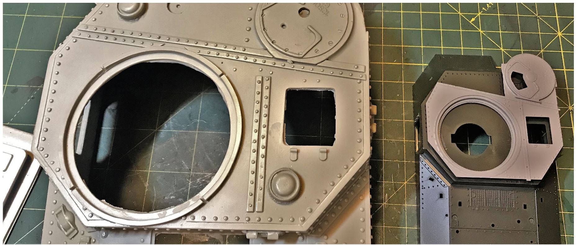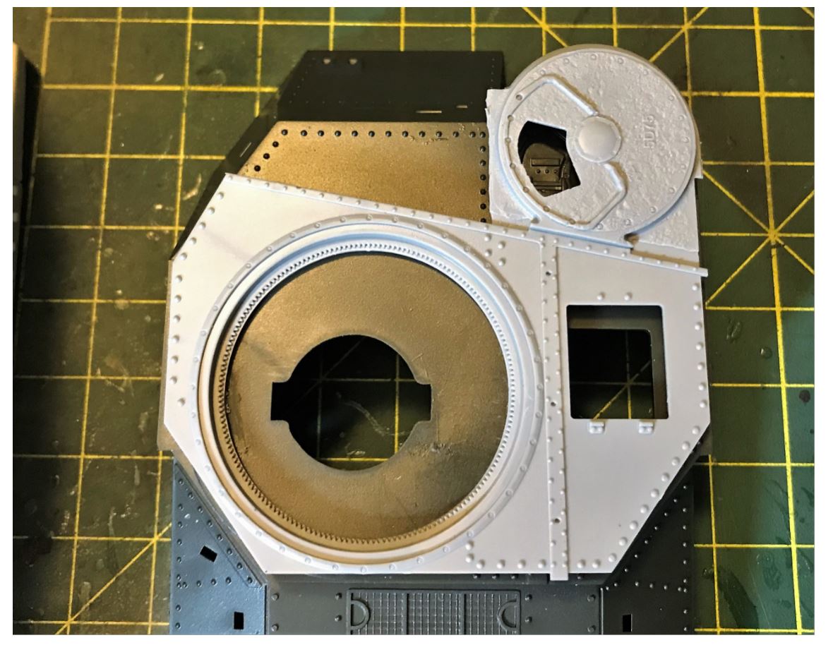 Overlaying the Miniart upper hull on top of the Tamiya kit, we can see the differences. The location and center point of the turret needs to be carefully studied in order not to make mistakes.