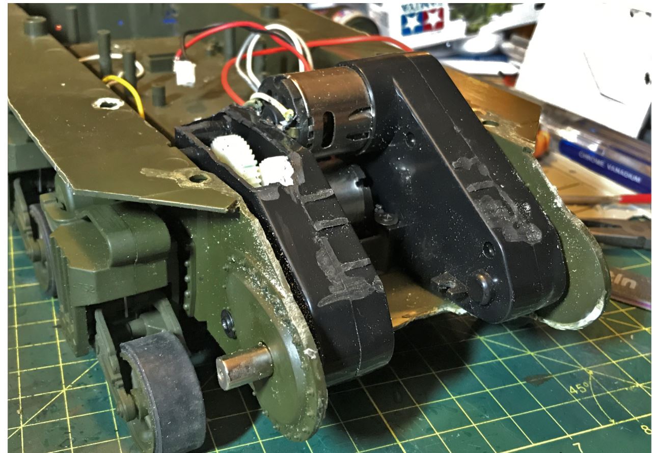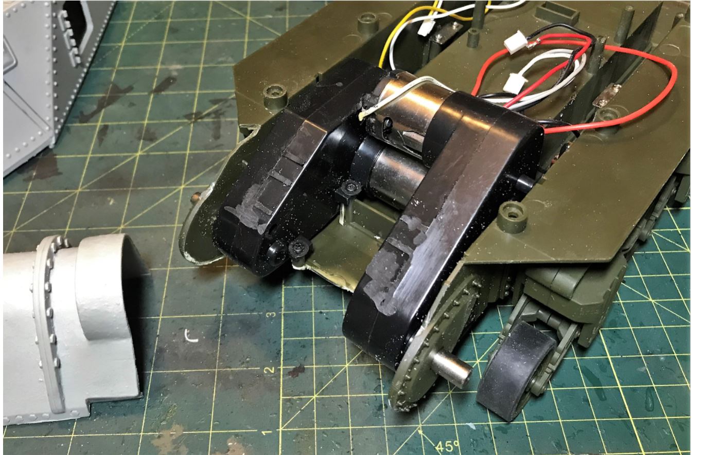 The right gearbox need to have its plastic cover removed in order to clear the flat area of the front of the upper hull main gun. The Mato gears are not touching anything and that is what is important.