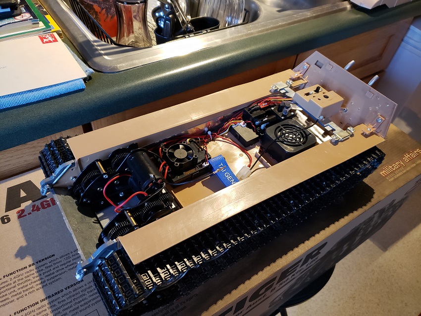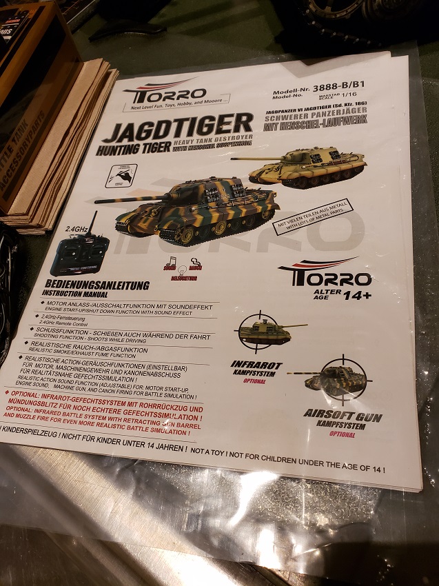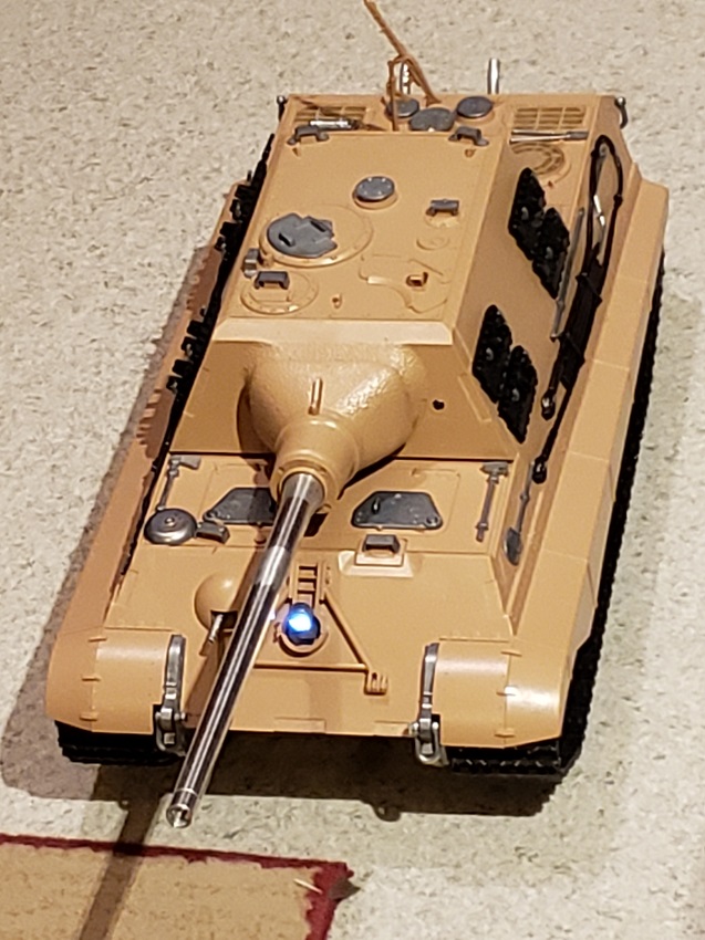 Well, Santa had other plans this year besides new tracks for the Stuart. I was very surprised to find this long coveted AFV under the tree on Christmas morning. I was just beginning to seriously put the Jagdpanther Build from last Christmas together when this Monster showed up. I swiveled direction so fast I think I hurt myself. ;o) Seriously, tho', I am awaiting parts to turn the Jagdpanther into an IR version w\ flash and recoil and this IR Jagdtiger is already set and ready to go. It was from a fellow out in CA who had quite a few of these and I cannot fault Grifter as he found a great Deal for an unpainted one here in the States. I normally buy from Taigen for entire vehicles but they had been out of stock for some time. The vehicle arrived with a couple of faults. Broken rear deck ( where someone got happy trying to push and lock the deck down ) and a non working bow mg. The deck I had repaired solid the first day out of the box. Looking at why the deck would not lock down, I put a washer apiece on the catches to lengthen them an 1/8 of an inch and the deck lock issue was resolved as well. On the way to repairing the bow mg, I removed the stock speaker and replaced it with one of Maxxmekker's Specials. What a difference in sound! You can feel the surface it is sitting on vibrate with the bass undertones of the idling Maybach. ;o) The bow mg had two issues, a suspicious looking melted area on the wires and someone at the manufacturer had put too short a length of fiber optic line in the barrel and it was not touching the bulb. I had originally thought, "Hey it is a plug in unit." "Just buy another" Easier said than done. Chatting with Dave from Forgebear, I got useful information and decided to just repair it myself ( It was during the fix that discovered the skimpy fiber optic cable issue ). The Smoker output was anemic as well but a closer examination showed how someone at the factory ( same guy?) had tied the exhaust tubing together under the catch for the upper deck and kinked both sides off. New tubing resolved that issue and the Smoker is working much better. So, aside from some detailing and picking a paint scheme I can move forward with this Detail Build. I cannot find a working Barrel Lock nor rear Deck MG so garnering some inspiration from an elder Matorro Jagdtiger Build by Jim Bob Wan, I think I can put the existing parts to work with movement. So without further babbling from me, Here We Go!
