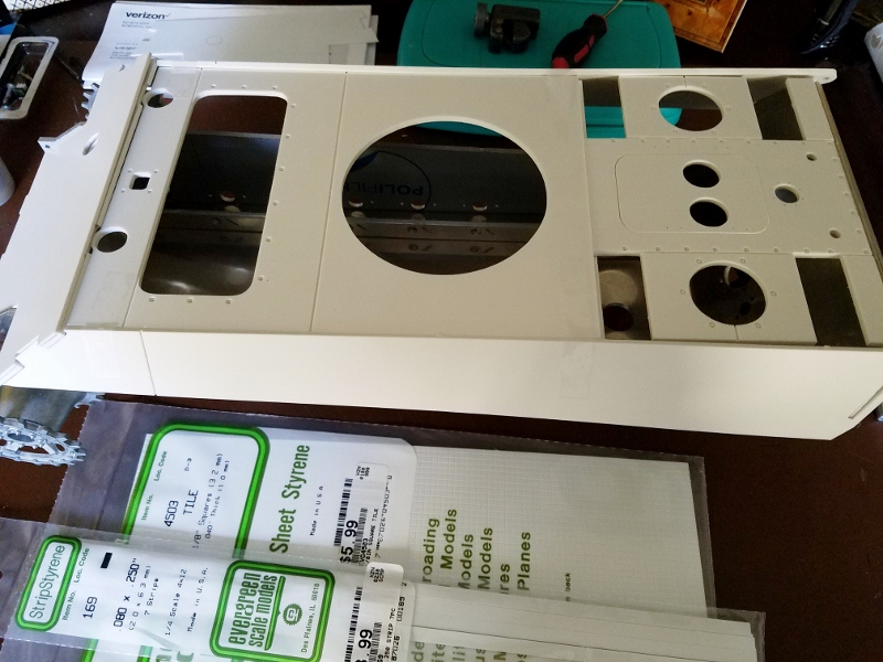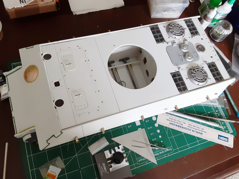 Sharp eyes will have seen that I failed to place a bevel at the bottom of the deck plate where it meets top interior of the rear plate. This is the same type of problem encountered when building the Wecohe Panther as those who have done so will appreciate. Though not entirely corrected as the build progressed, the error was somewhat ameliorated by an application of putty filler which actually worked quite well for the purpose. While I am aware of the flaw, it's not really so obvious later in the build. I mention it here because the absence of beveled parts is something to keep in mind when constructing a tank from flat styrene, another factor I failed to take into consideration at the outset.