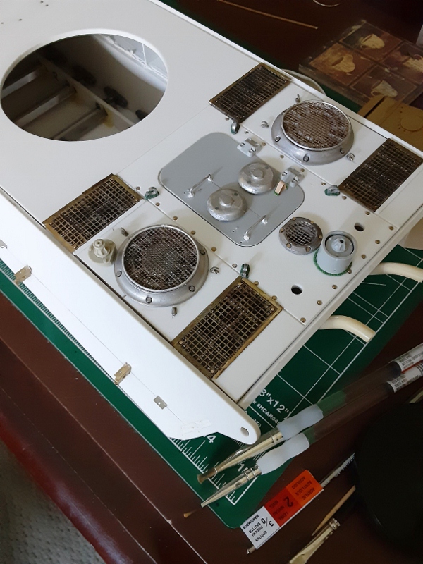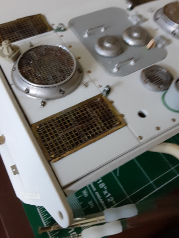 The rectangular grills are plastic-like screens. The idea was next to add a second mesh grill of a slightly different mesh opening size to create a double mesh grill effect, an idea (shamelessly) copied from an example seen elsewhere. The brass mesh grills are PE for a Tiger I.
