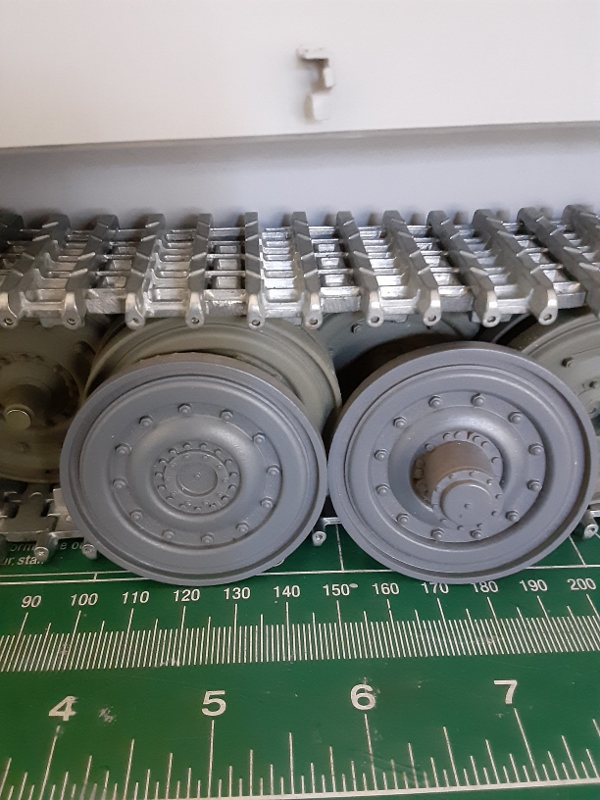 The profile of the outer road wheels, while close, was not quite what I had been looking for in this build. The problem was there were no correct profile Panther II outer road wheels. Working with another of our colleagues, PatrickH, we came up with the idea of replacing the outward facing outer and inner road wheels with 3-D printed wheels that could attach to the metal inner paired corresponding wheel. This was an 'iffy' proposition, concerning because we didn't know quite how to mate them and retain some structural stability to the model.