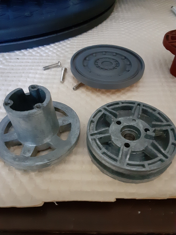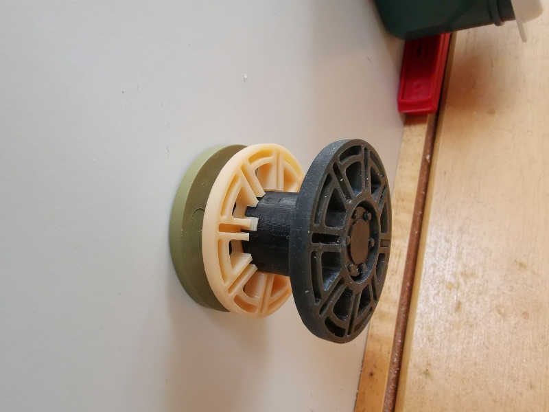 Here is the result of the experiment. In the original metal idler, the attaching axle pin extends through both the outer wheel and the tube housing and through the two inner idler wheels and then, finally, into the idler arm. To make up for the absence of the space taken up by outer wheel inside the tube, an elaborate system of three stacked bushings were created. Sort of like the stacked Russian doll treatment. I'm sorry I failed to take a picture of this stacked bushing system. My thanks to PatrickH for coming up with it. It was an important part of maintaining body integrity for the idler because we needed the axle pin to protrude only a certain set distance into the idler arm.