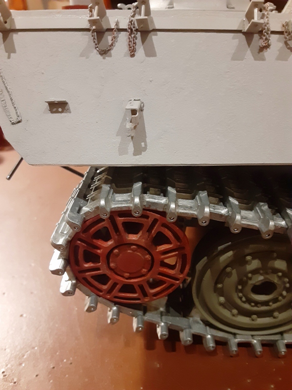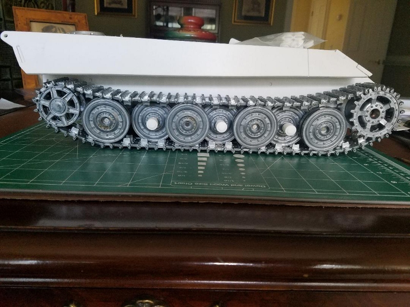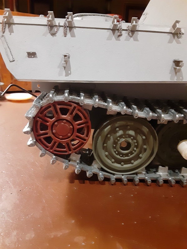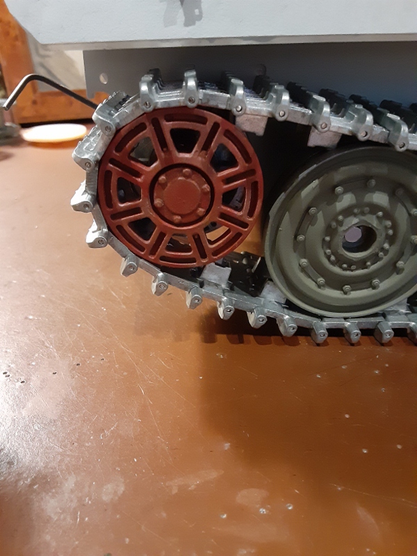 After attempting both Taigen Panther and Tiger II swing arms for the chassis, I settled on the Panther arms and a rolling chassis consisting of Taigen Tiger II road wheels, Kenny Kong Tiger II transport tracks with 16 spoke drive sprocket and Taigen idlers.