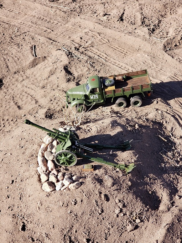 I had time to clean up the Tank Area today and (literally) shovel together a crude gun emplacement to show off the 10.5 CM Field Artillery under tow by a Lend Lease International Harvester KR -11 heavy hauler. Pics are here for this initial thread and a video was done and is under construction ( mainly to hide the harsh language used when I drove off the graded road into soft sand and dirt and got the rig stuck...repeatedly ;o) and I will add the link here when it is done. Enjoy!