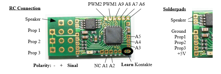 Anyway, due to the sound length is quite small, this is not really needed... You can program the radio to trigger one sound with the PROP 3, AND, this is the best part, another two sounds with the PROP 2, sending a +100 and a -100 of signal, just connecting wires from the Dasmikro to the receiver. As easy as that. But yes, definitely id say you need a programmable radio, or at least one with screen so you can see what the hell you are doing.
