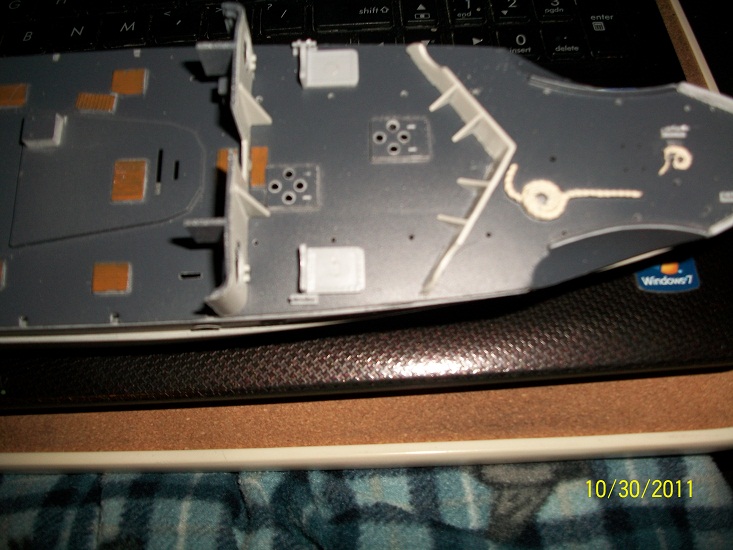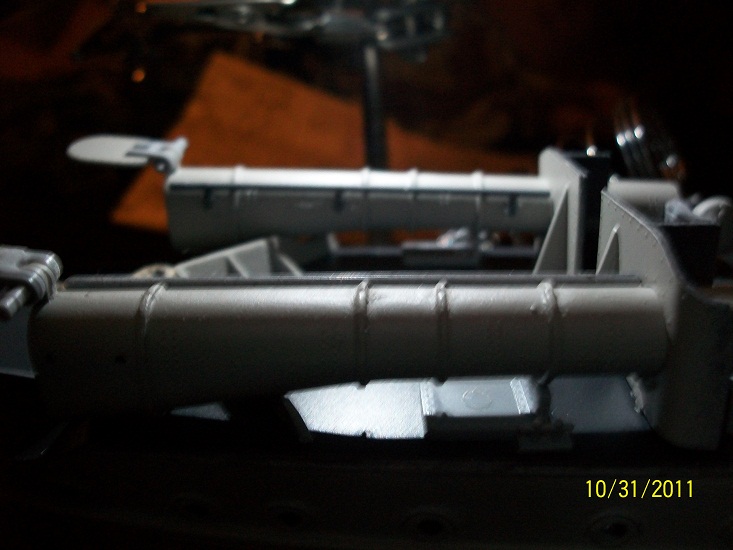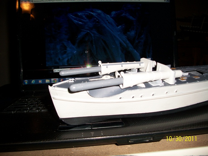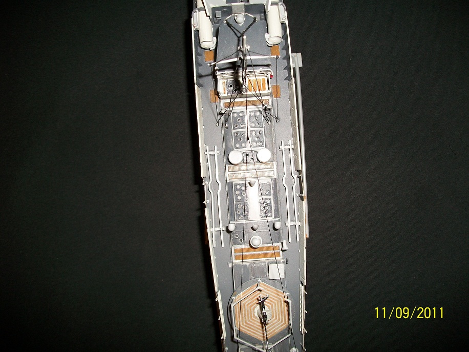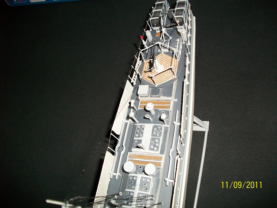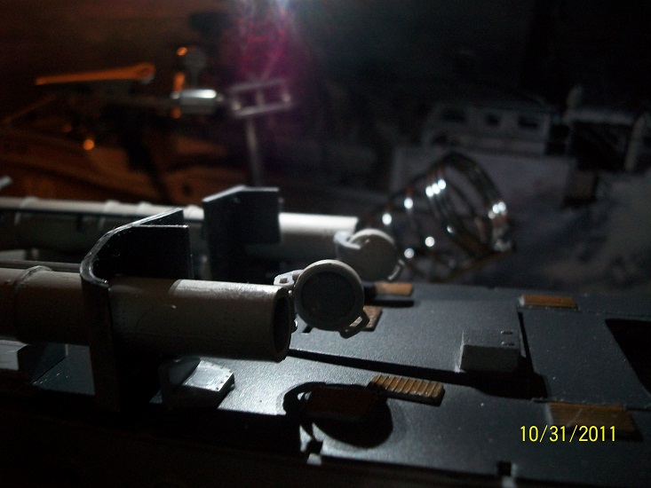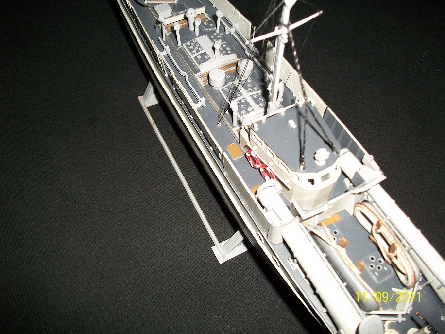 Added some detail parts,Torpedo Tube Hatches which were very difficult to assemble. Also the Loaders hatches seem to be somehow wrong,to open enough for the Torpedo to load the hatches are prevented from swinging 90 deg. as they are to close to the Command Bridge? The Operators handle on the Depth Charge racks were difficult as well to assemble,but do add a nice detail to this build.