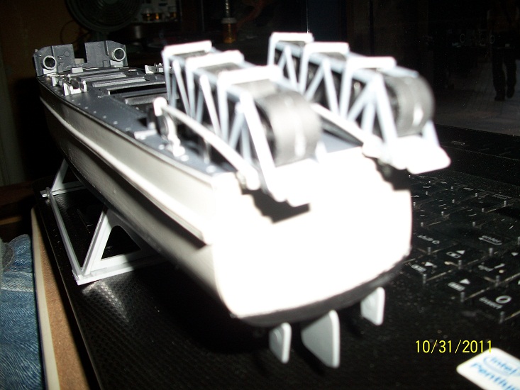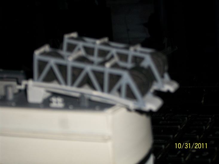 The railing on the Anti= Aircraft mount was very difficult to assemble,but after some time spent assembling each joint,to the upright station post the finished result makes it worth the effort. The mast behind the main command cabin has a pivot post type support,this was not to difficult to build,the rear hatch and wooden step platform also add nice detailing.
