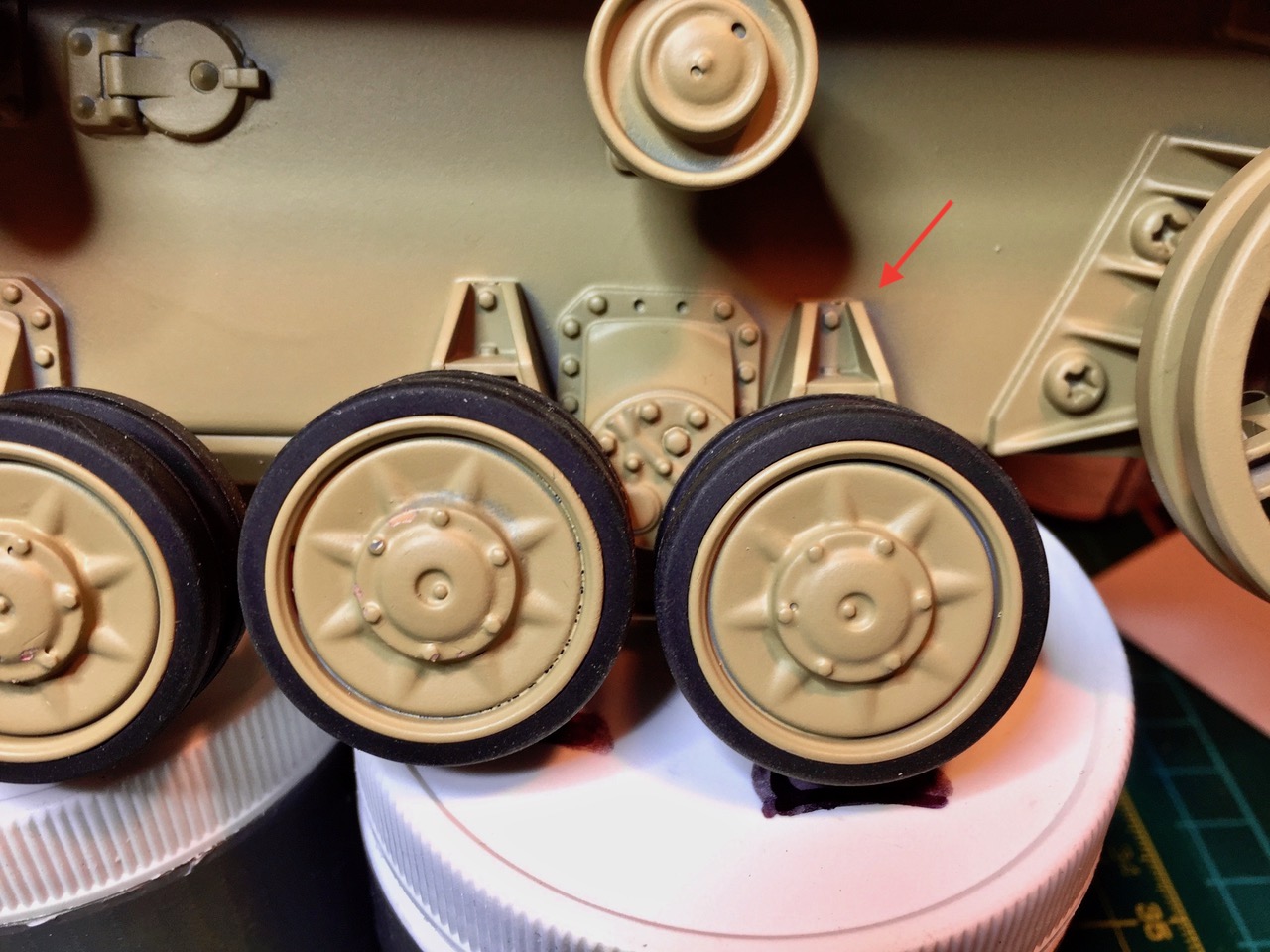 You mean directly in front of the idler, how that piece is lower than the others, which are all in line with the top of the attachment point cover for the bogeys? If so, I see what you mean and I wonder if that's because it's the last one before the idler? Maybe to prevent track binding between the last roadwheel and the idler or something?