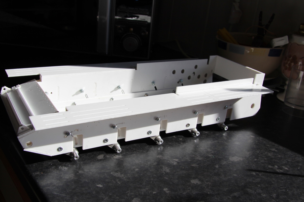 Hull/ Chassis. Christian's instruction Pdf. shows the suspension arms being fitted before the track plate/ mudguard assembly is fitted to the hull floor. As it's crucial to get that joint absolutely plumb at a right angle, I decided that to have spring loaded arms in the arrangement process wouldn't be the best method of doing that...