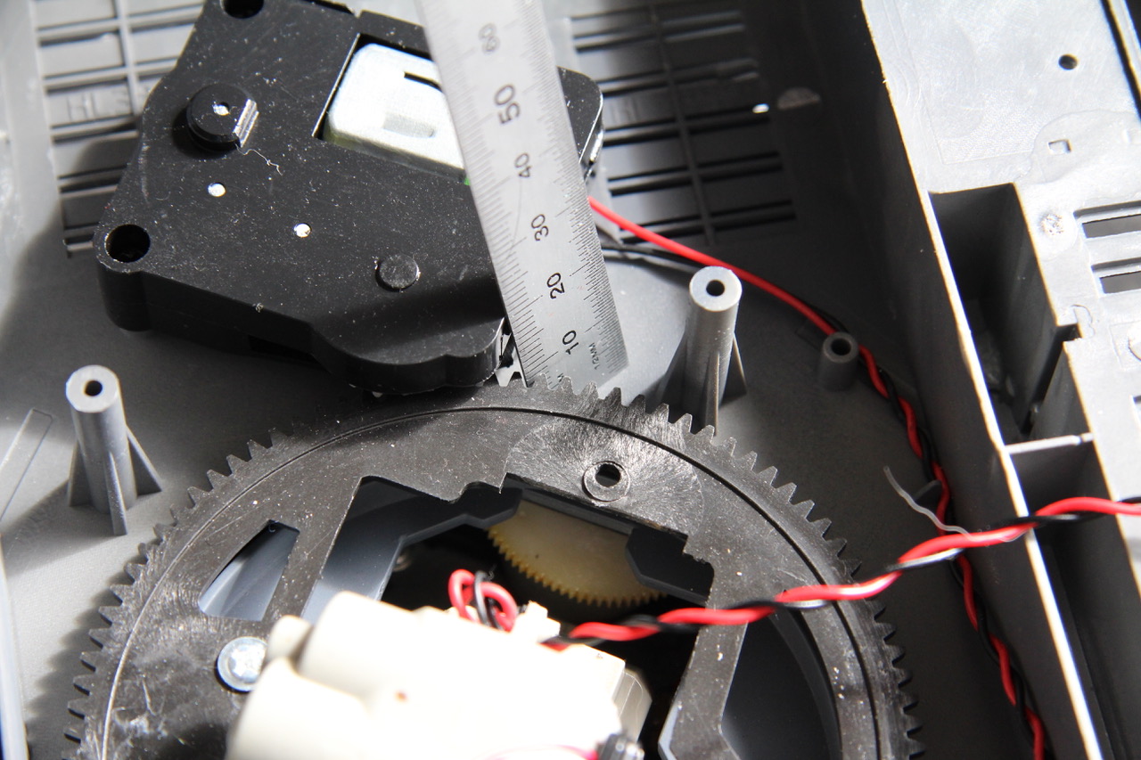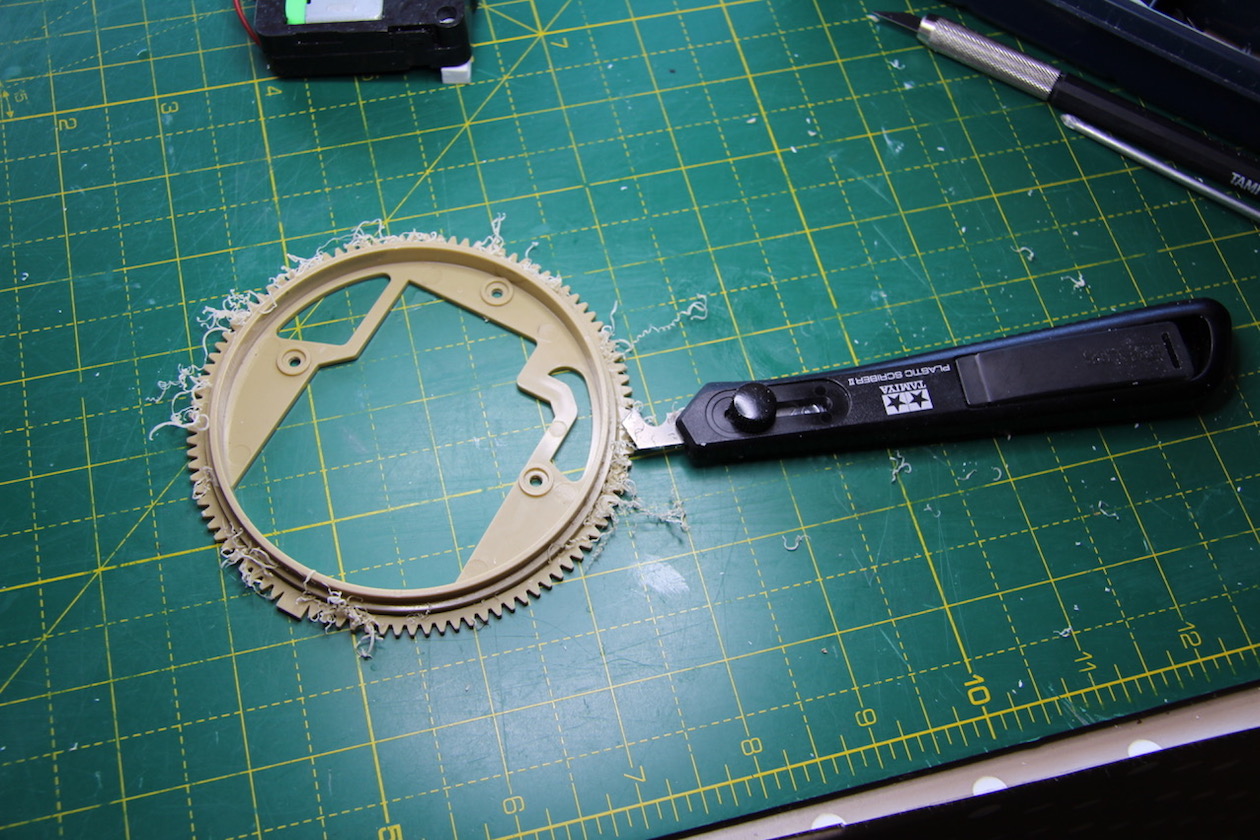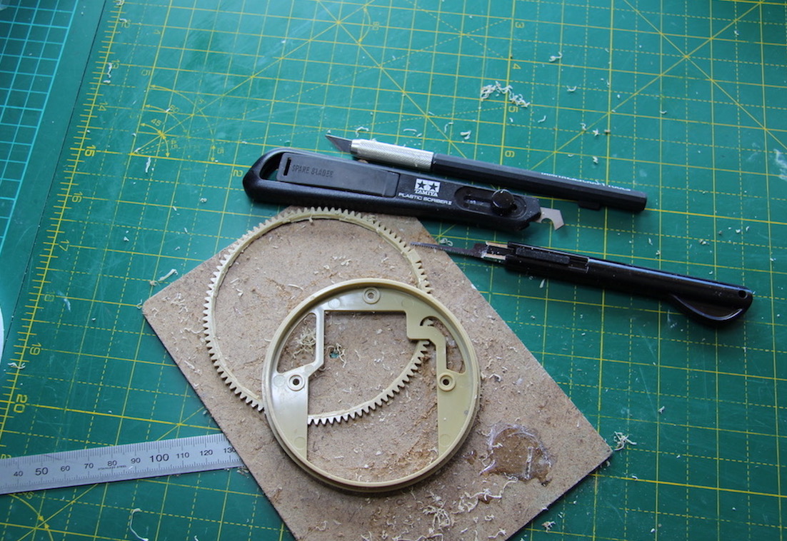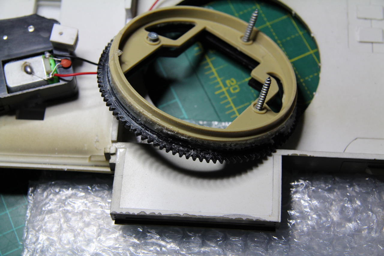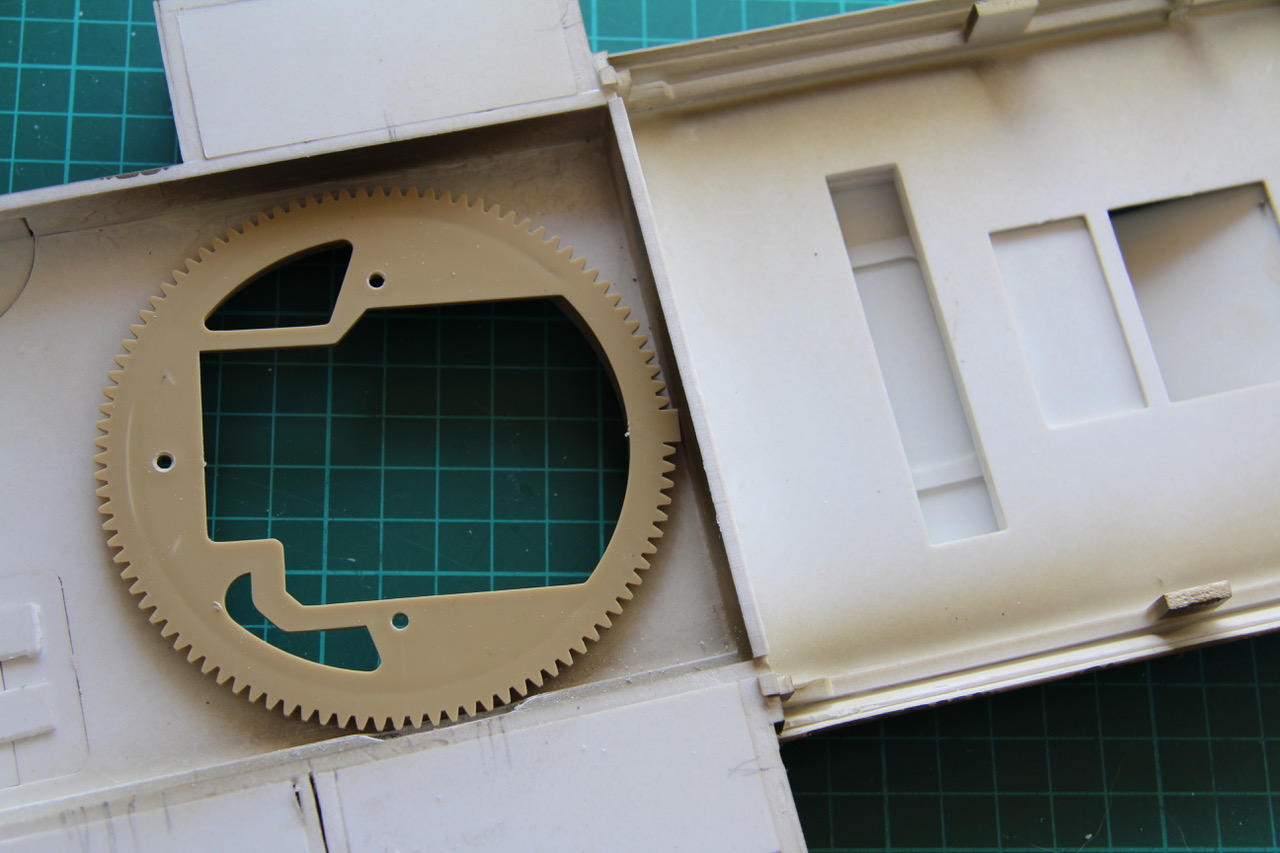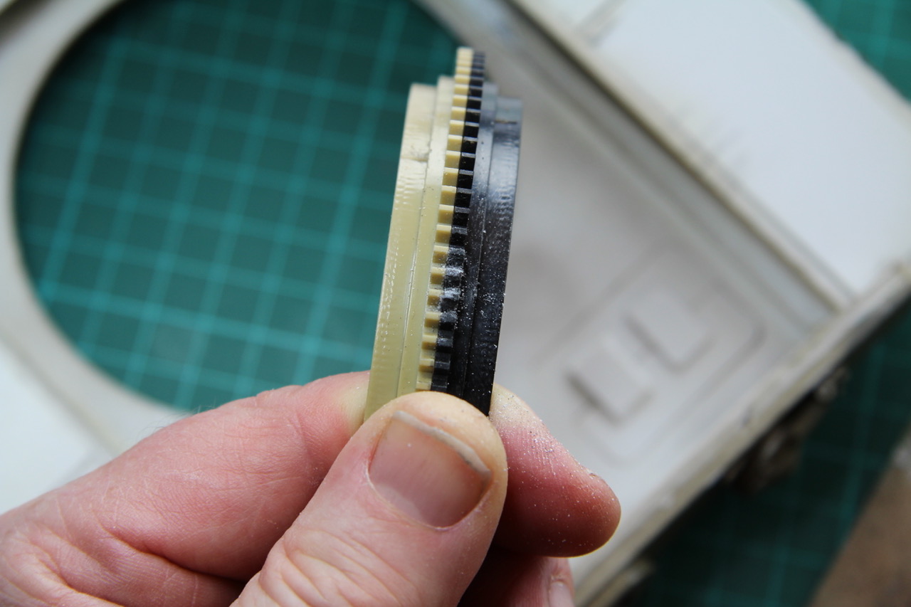 ). Then I had to cut the ring off the other turret ring, and trim 2mm of the ring flange to. By careful measurement, I found that if I bonded the doctored amber ring to the black one, I'd have the height I needed to make the turret ring and turret motor gears mesh properly. With not alteration, the mesh