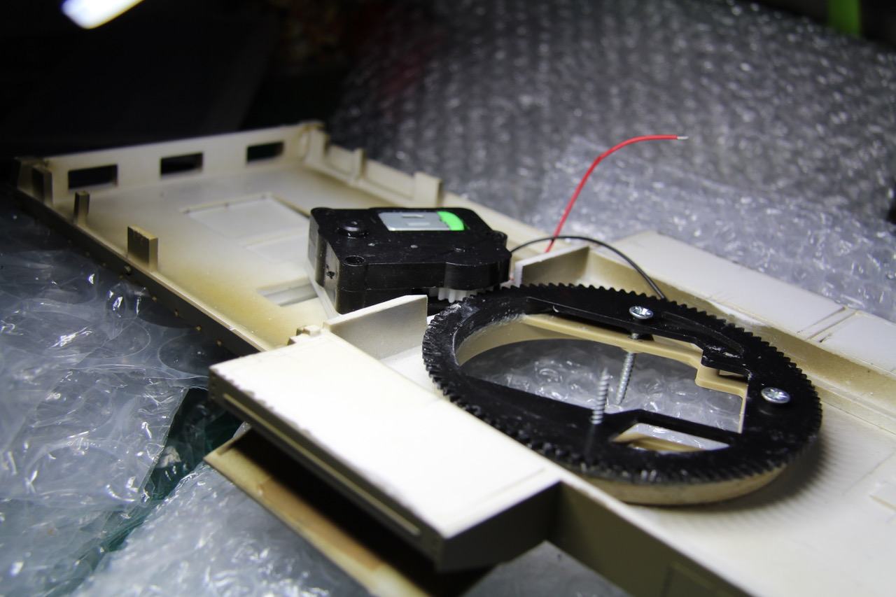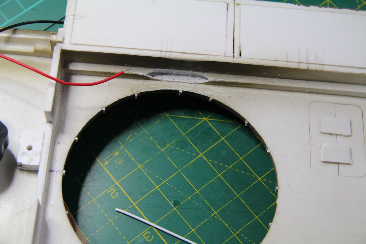 First, I had to cut out a section from the central bulkhead in the upper hull to accommodate the driven wheel of the turret motor. The motor wouldn't fit anywhere else. Then it needed 5mm standoffs, which I then made.