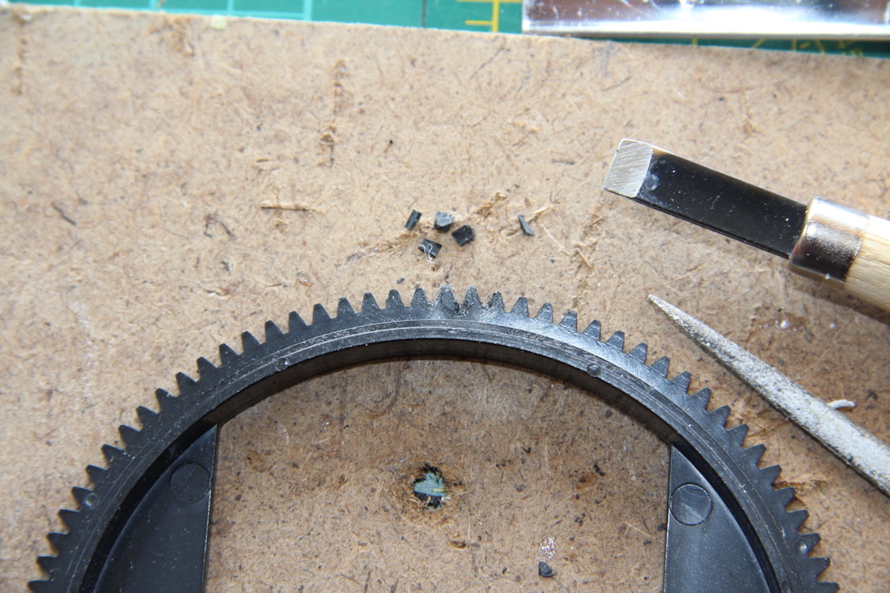 Then I had to convert the (black) turret ring for 360 rotation, by cutting two new teeth. (haven't cut teeth for many, many decades