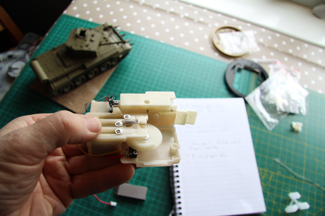 to work out where to fit the unit in the turret, in such a way that the barrel can rejoice fully, and have a reasonable amount of elevation. Given the absence of any fixed fittings: captive nuts, lugs, moulded- in- standoffs