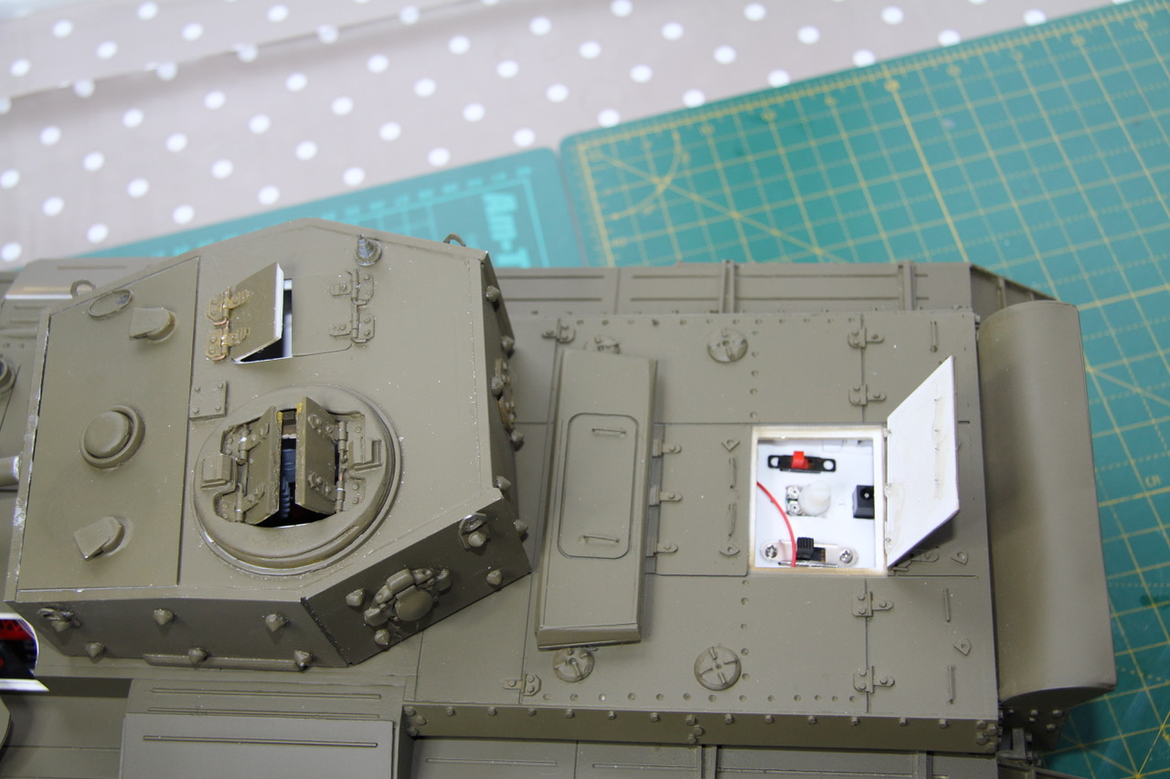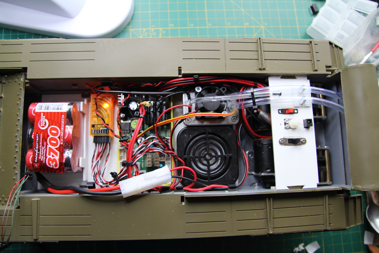 Here's the final arrangement of the Hull electronic components, with the circuits live. Turret and upper hull wiring yet to be settled. and again: Although my experience of using RC servos is, hitherto, non-existent, I've a fair knowledge of electronics through hi-fi, recording, and car digital systems..