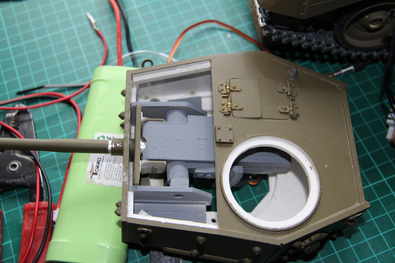 Still have to refit the MG in the Mantlet, but have no plans to make it a 'working one' just yet. and the pert posterior: Now, the abiding issue of servos. I've designed a bracket to hold the servo for the barrel elevation. Thing is, as a fixed unit, it has to be perfectly positioned in the horizontal and vertical planes- and that's really hard to work out. Does the centre axis of the servo drive wheel line up with the middle of the elevation gear (seen through the Commander's cupola aperture), the bottom, or the top? That depends on the inherent travel of the servo..an unknown so far; and the rotation direction.