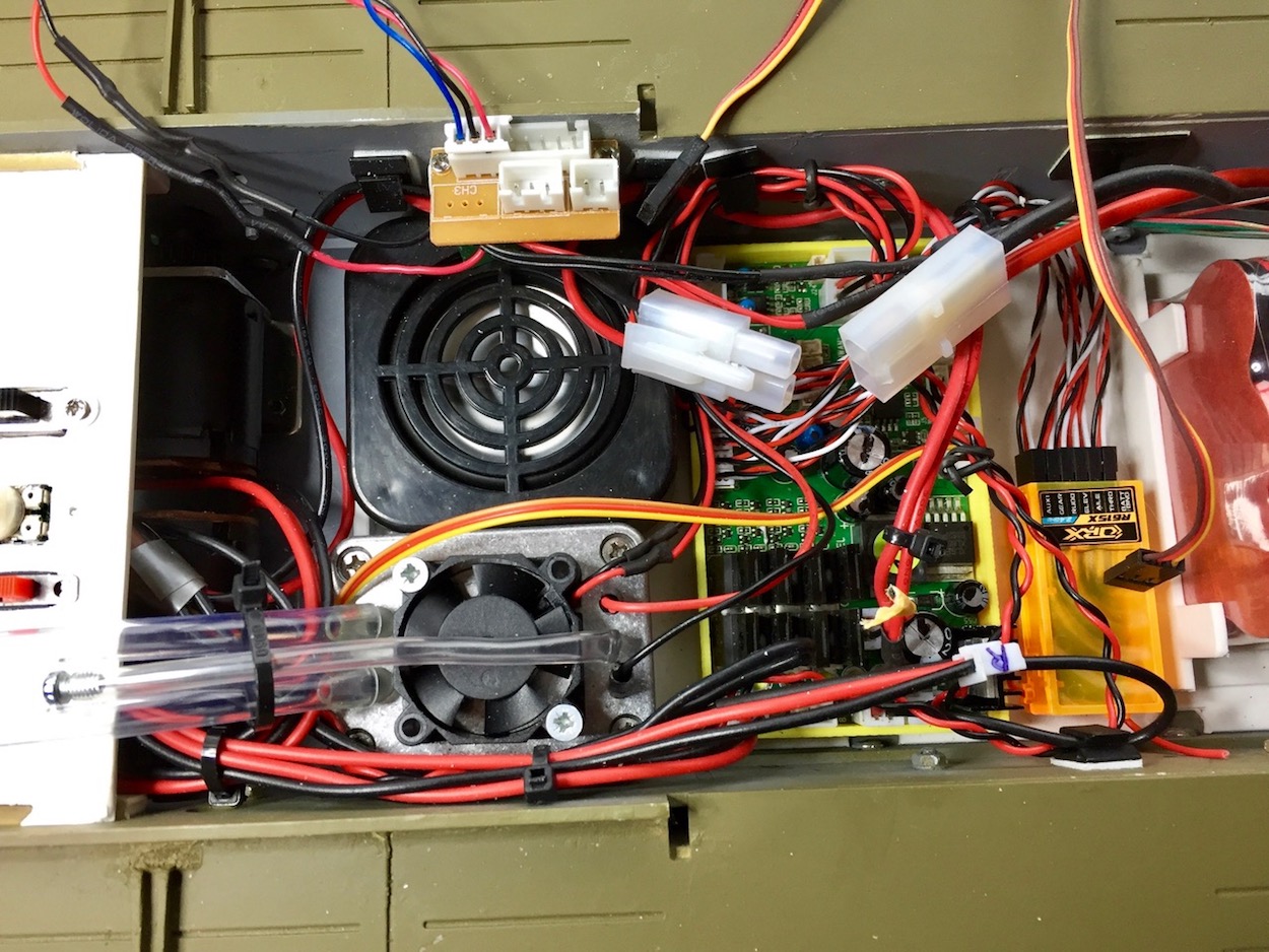 All that remains to be done here is to connect the 8-pin cable; the two servo cables from the turret, and then reconnect the battery. On the very first connect-up, the smoker and all lower hull functions were fine, apart from the right motor, which locked up. The elevation and recoil servos were working with a remote 6vdc battery pack, and should work (fingers crossed ) when connected to the TK 60.... 8O